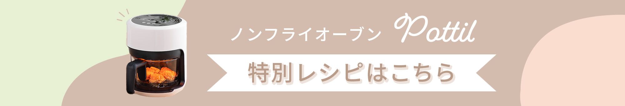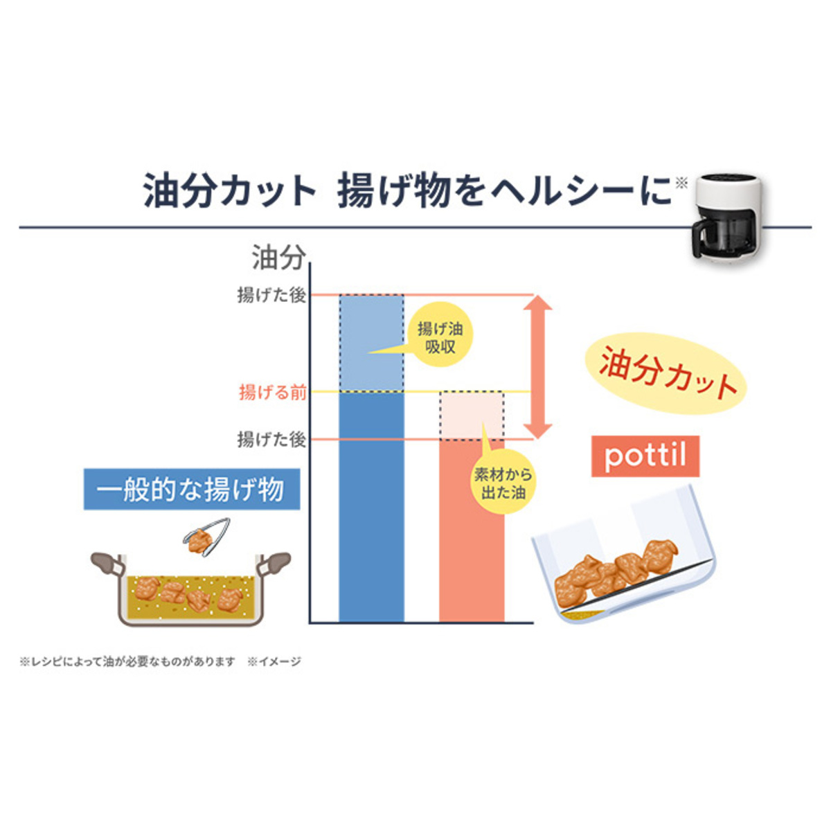 オーブン、グリル、フライヤー、トースター、お惣菜などの温め直し、ドライ(野菜チップスの調理等)などで使える多機能のノンフライオーブン。高温の熱風を循環させることで、油を使用しなくても*サクッとジューシーに仕上がります。付属のレシピブックには、ノンフライオーブン pottilを使って作れる10のレシピが掲載されています