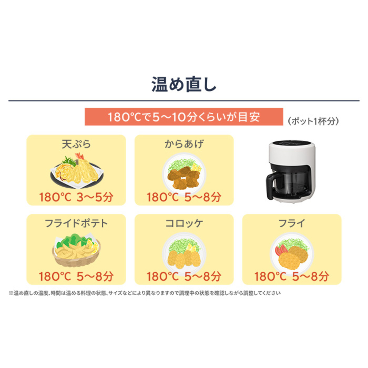 油の始末もいらず手軽にできるのではないかと思い購入 一人分・少量料理でしたら良いかもです 複数人用には不便 時間がかかります 思ったほど手軽ではなく ガラスの容器も結構な重量 容器の洗浄は確かに楽ですが その上に付いている金網の発熱板も使用後お掃除せよとの説明書き・・ 機器周囲もかなり暑くなりますので 広いアイランド型キッチンでないと使い勝手を選びます 上手に使えると良かったのですが 私には適さないものでした
