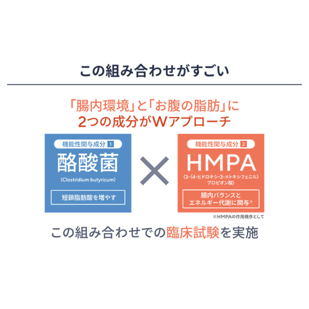 本品(ラクビ プレミアムA)には酪酸菌(Clostridium butyricum)、3-(4-ヒドロキシ-3-メトキシフェニル)プロピオン酸(HMPA)が含まれます。継続摂取により、善玉菌(酪酸菌)、短鎖脂肪酸(酪酸、酢酸)を増やし、便秘気味の方の腸内細菌叢(腸内フローラ)、腸内環境を改善する機能、便秘気味の方の便通(量、回数)を改善する機能、BMIが高め(23以上30未満)の方のお腹の脂肪(内臓脂肪、皮下脂肪)、ウエスト周囲径、体脂肪率を減らし、体重が減少するのを助け、高めのBMIが低下するのをサポートする機能があります