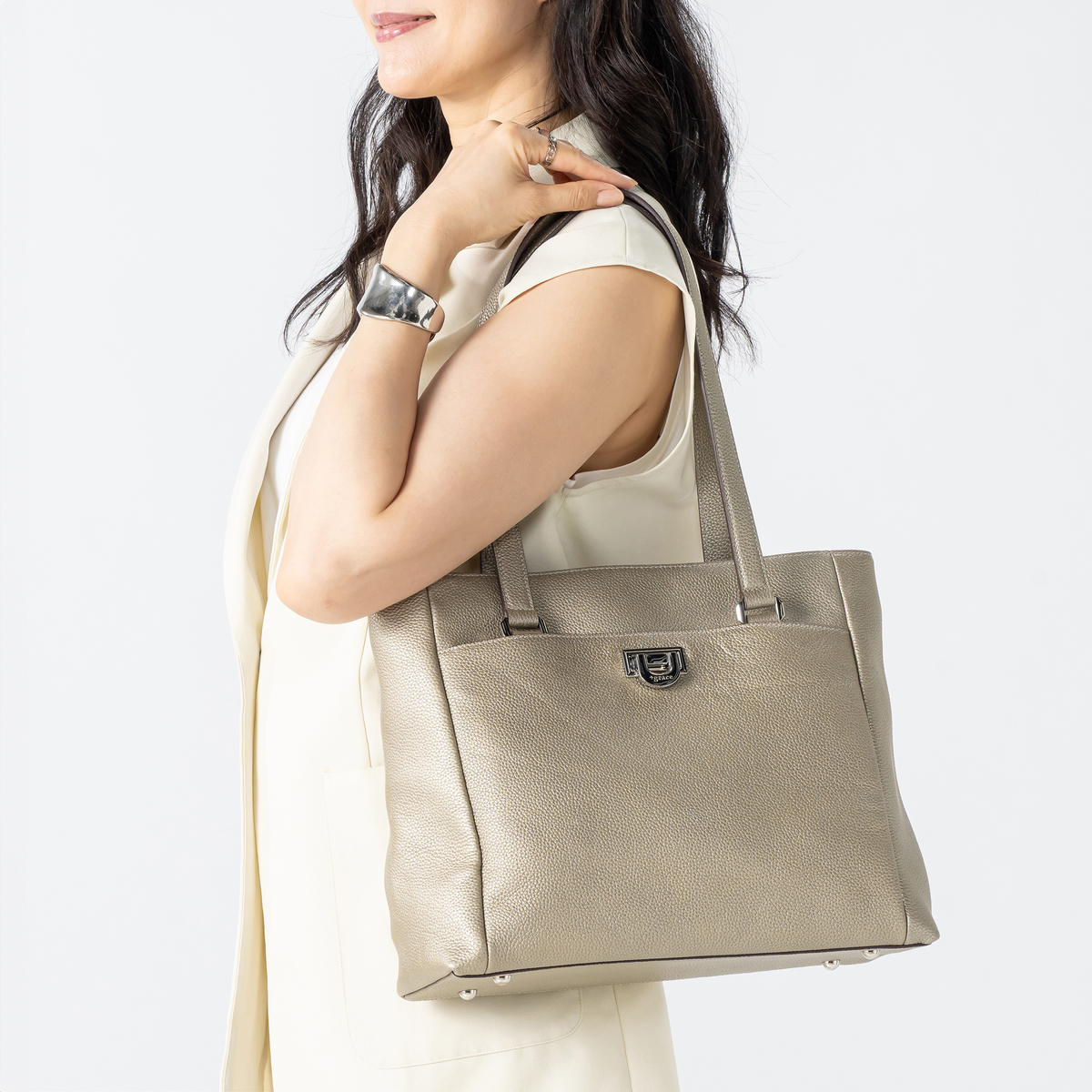 QVCジャパンオリジナルブランド「+grace」から、クラシカル&エレガントなデザインのトートバッグをご紹介。センターのオリジナルロゴ入り金具がアクセントになっています。傷がつきにくくシワになりにくい、シュリンクレザーを使用。しっかりとしたレザー使いなので、平置きした際も倒れにくく、自立してくれます