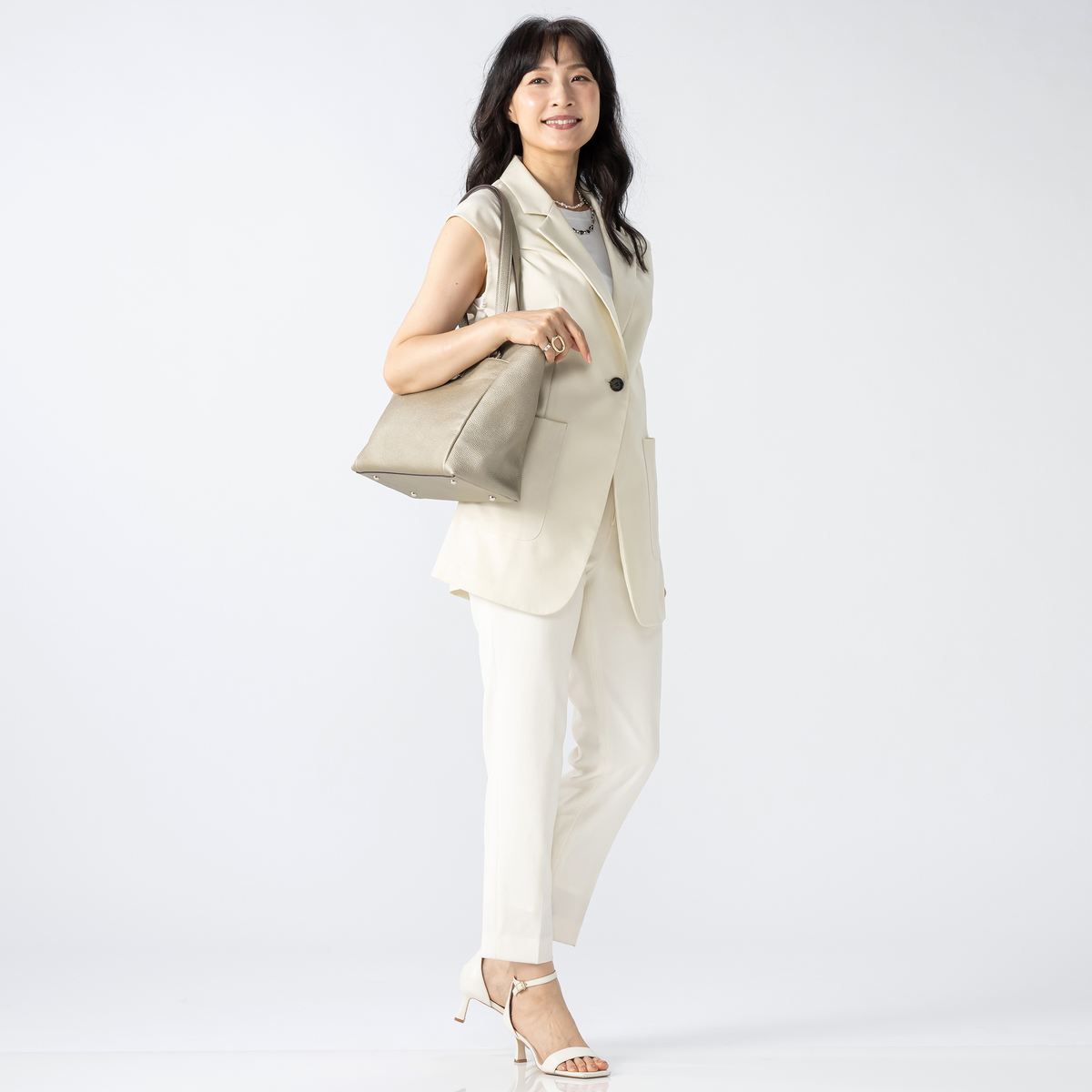 できるだけ製品の軽さを追求し、軽量で高級感のある裏生地を厳選。手触りの良いシルクタッチの裏生地は、ドレープしてもなめらかで美しい曲線を描き、エレガントな印象を与えます。また、バッグ本体のカラーにあわせて明るいカラーを選定することで、内部の視認性も良くなり、荷物の出し入れもしやすい仕様です