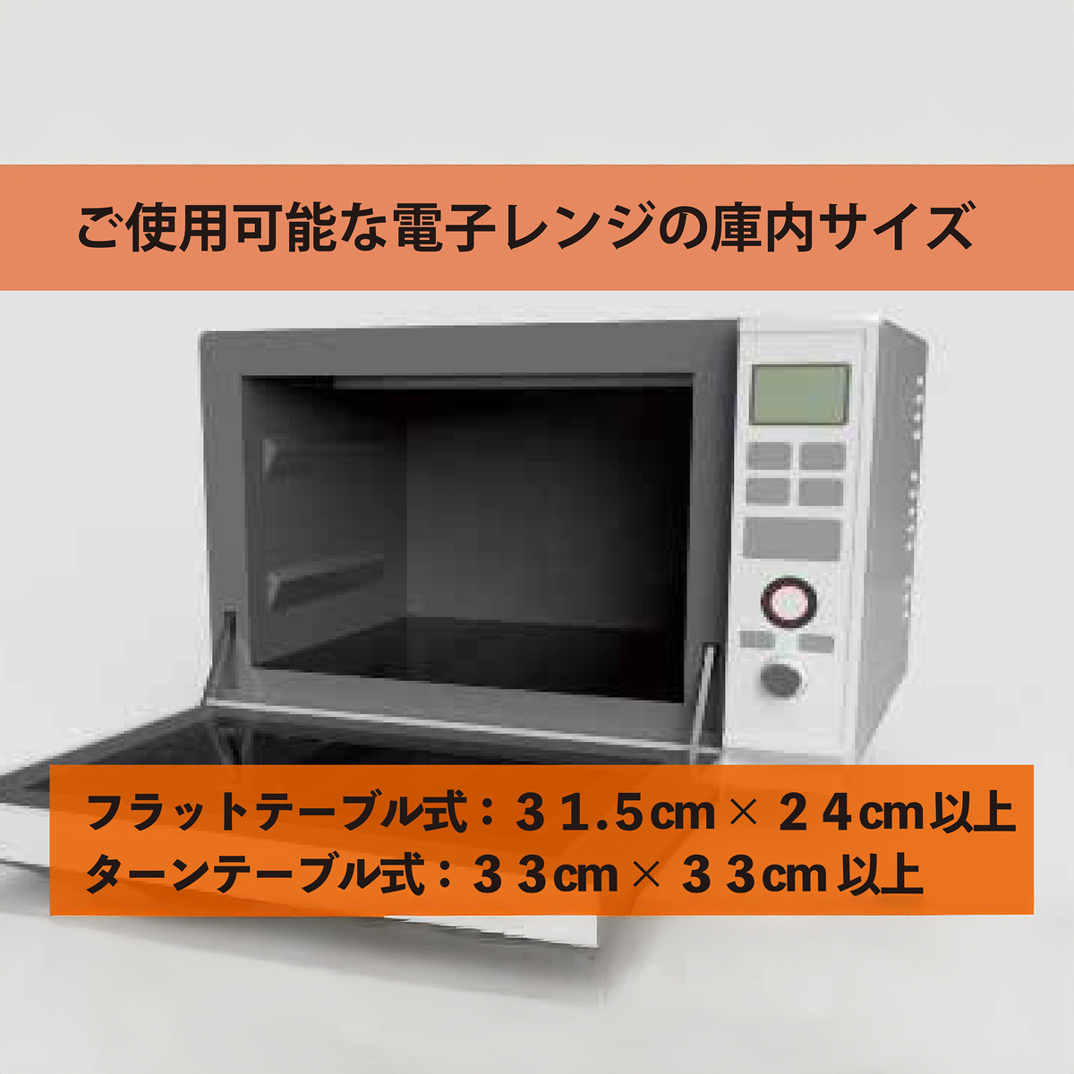 ●必ず1000W以下の電子レンジを使用してください。●手動設定(W数と時間を指示する)のみに対応しています。●ターンテーブル式のレンジの場合、庫内サイズに余裕がないと回転時に当たる場合があります。サイズが合わない場合は絶対に使用しないでください。●本品が電子レンジ庫内の壁に触れないようにサイズをよくご確認ください。
