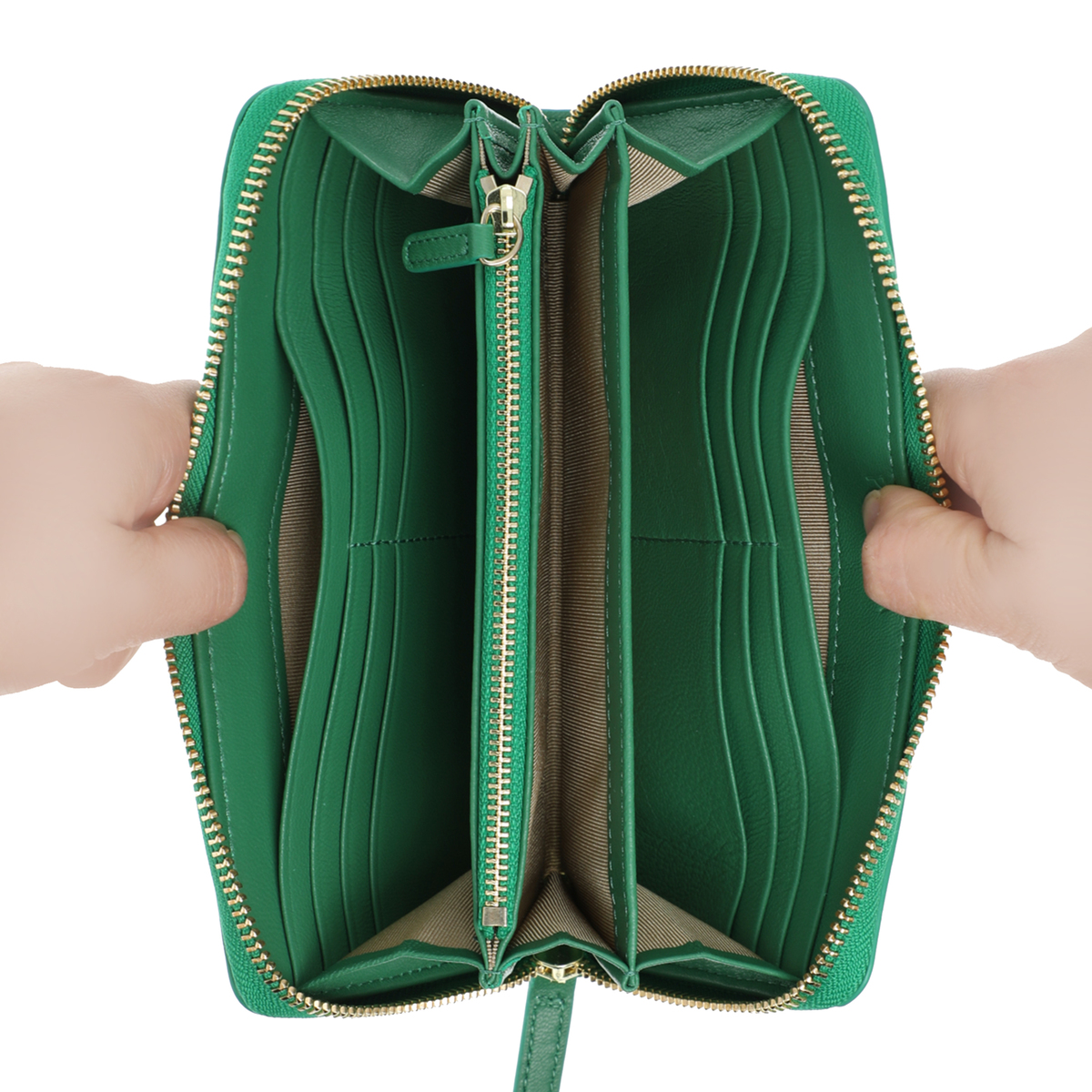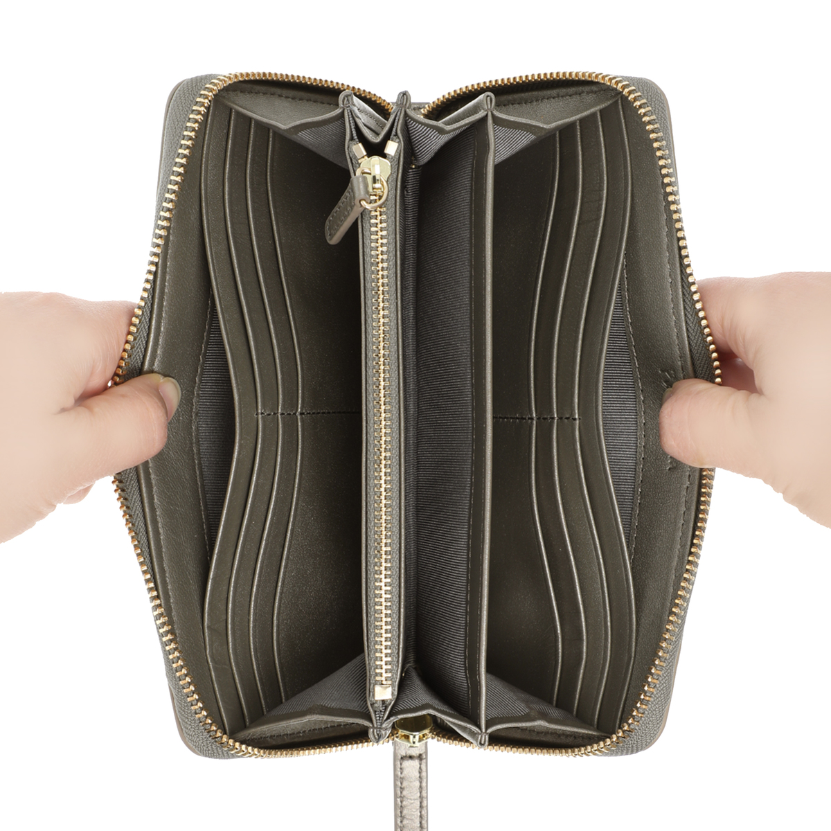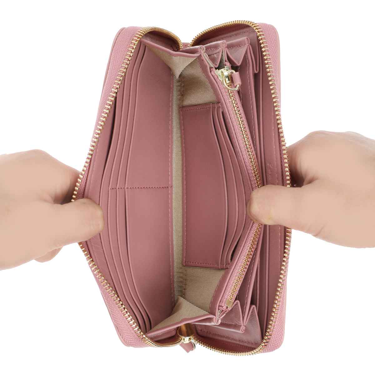 女性の手に収まりのよいサイズ感にこだわり、使い勝手の良さを追求。小銭、お札、カードをしっかりと収納できるように作っています。メインファスナーを開けると一目で中の物が見わたせ、探しやすくなっています