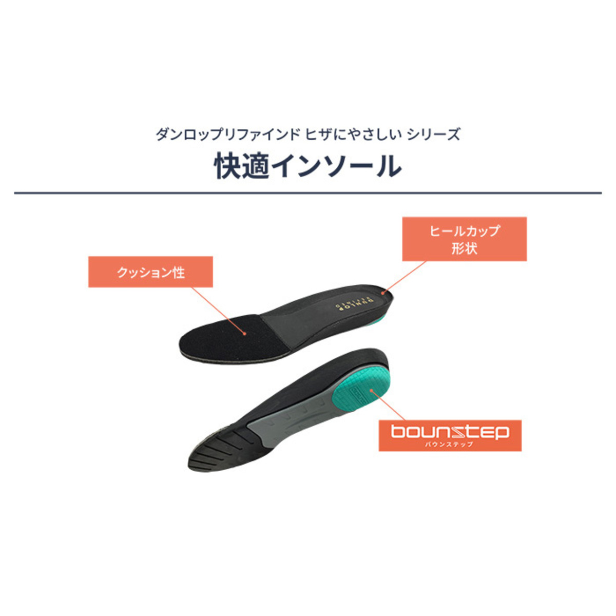 柔軟性と弾性のある素材でクッション性が良く、ヒールカップ形状により踵のフィット感がいいインソールを搭載したシューズ。かかと部分に高反発発泡体と低反発発泡体から成るバウンステップの構造を持つ靴底として、特許を取得しています(特許第5257714号)