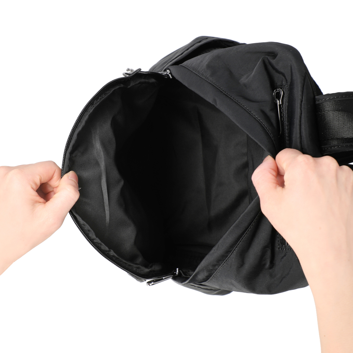 メイン収納部はダブルファスナー仕様で、A4サイズが収納可能。スッキリした見た目以上に収納力があります。底マチは、背面に向けて広くなるカマボコ型で、正面の印象より容量がアップします