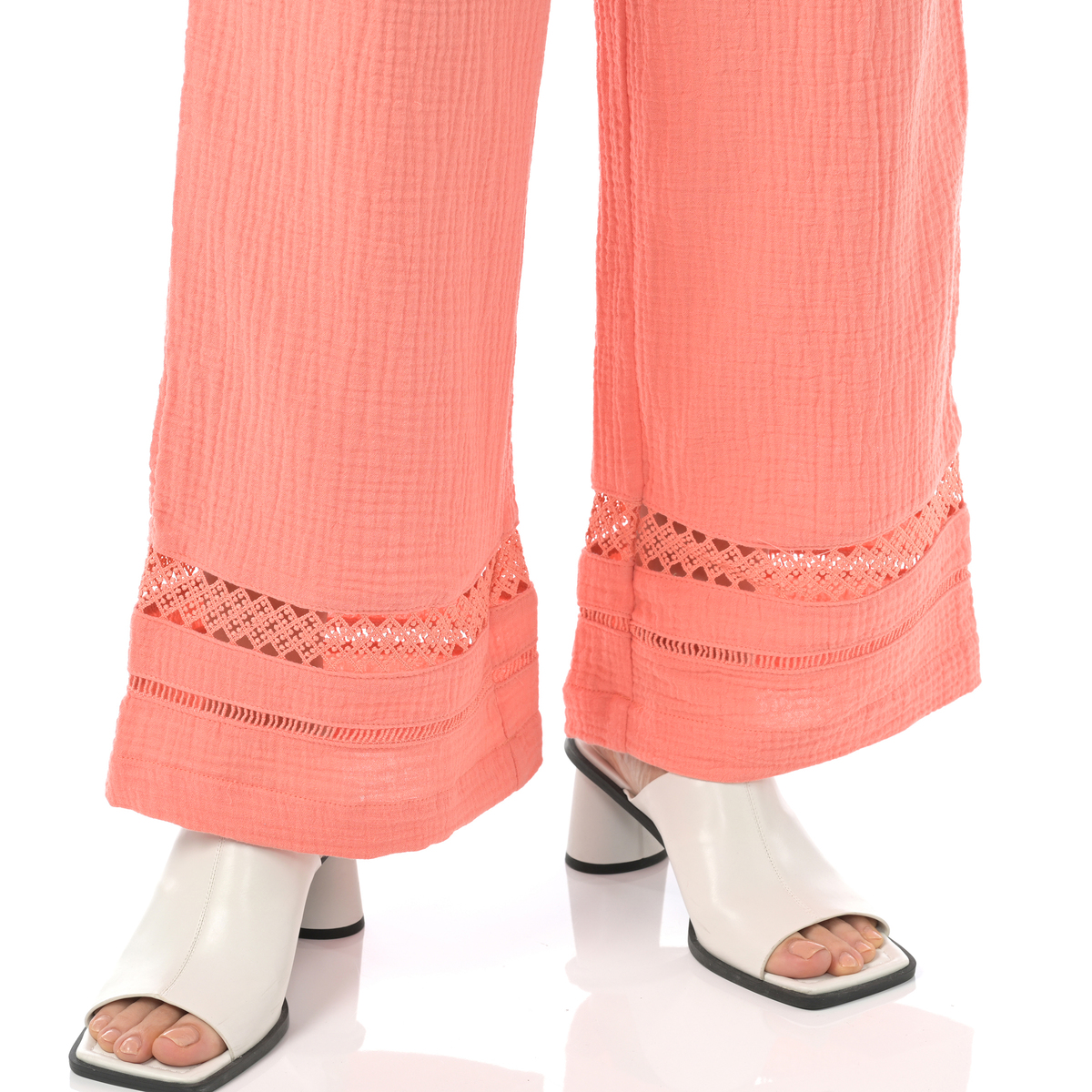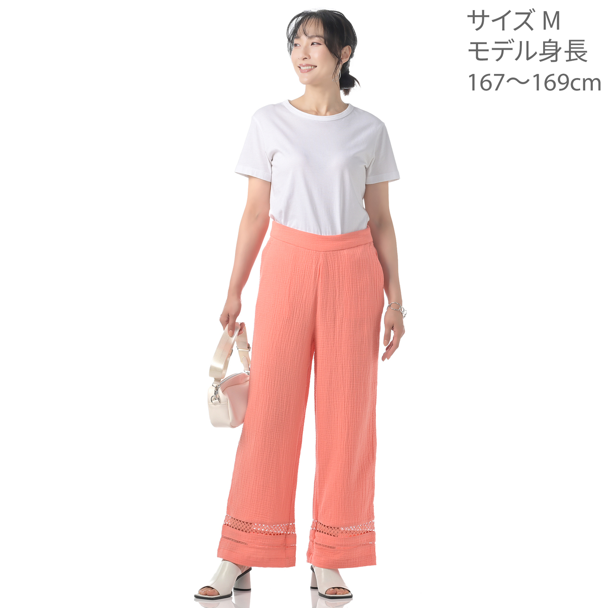 リラックス感のあるプルオンタイプのワイドパンツ。裾にあしらった同色のレースがさりげないポイントです