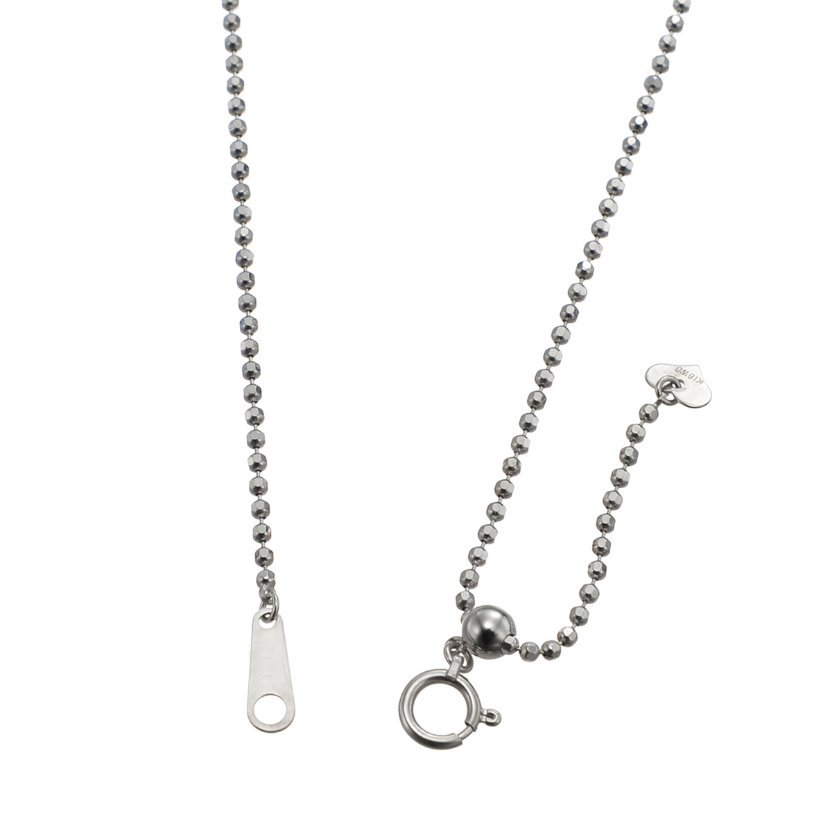 首の横から後ろに掛けて、キラキラとしたカットボールチェーンを使用しました。留めやすい大きめの引き輪を使ったスライド式アジャスター付き。装いやシーンに合わせて、長さの調節ができます