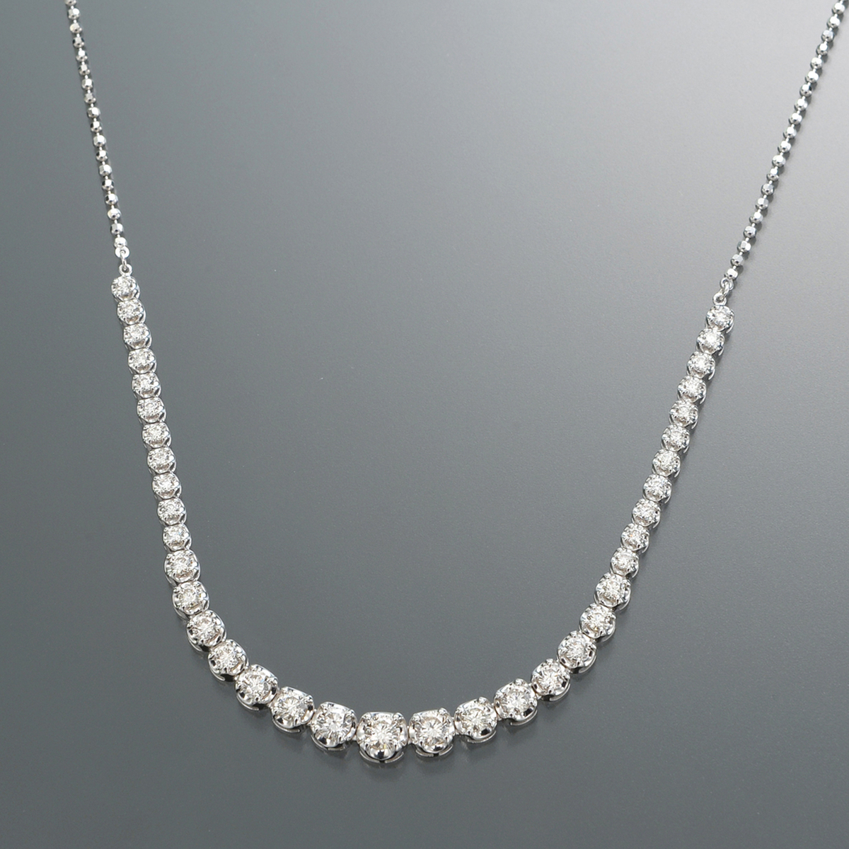 ダイヤモンドの輝きが胸元を彩る、グラデーションネックレスです。ダイヤモンドを37石連ね、合計で2.00ctUP使用。連なりがバランスよくデコルテの中心部に来るようにセッティングしています