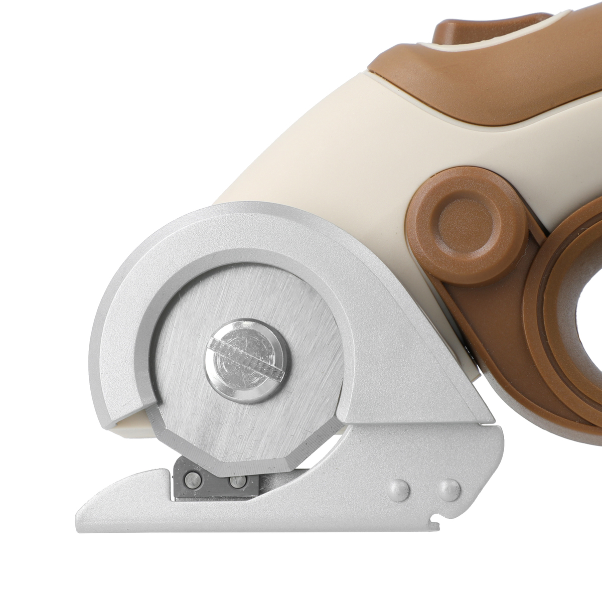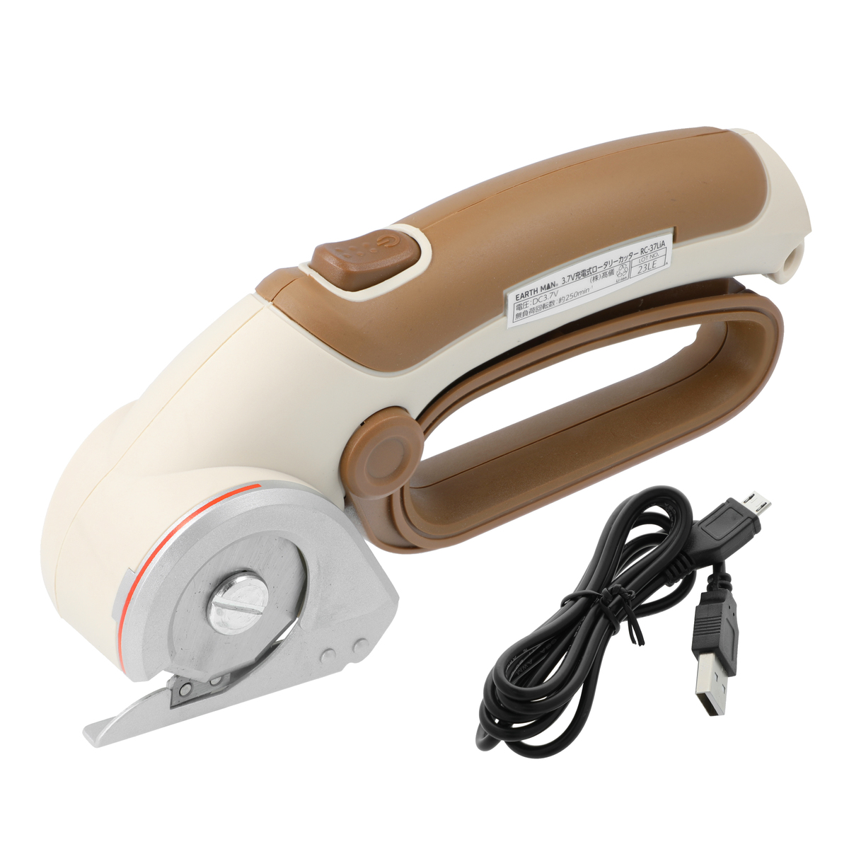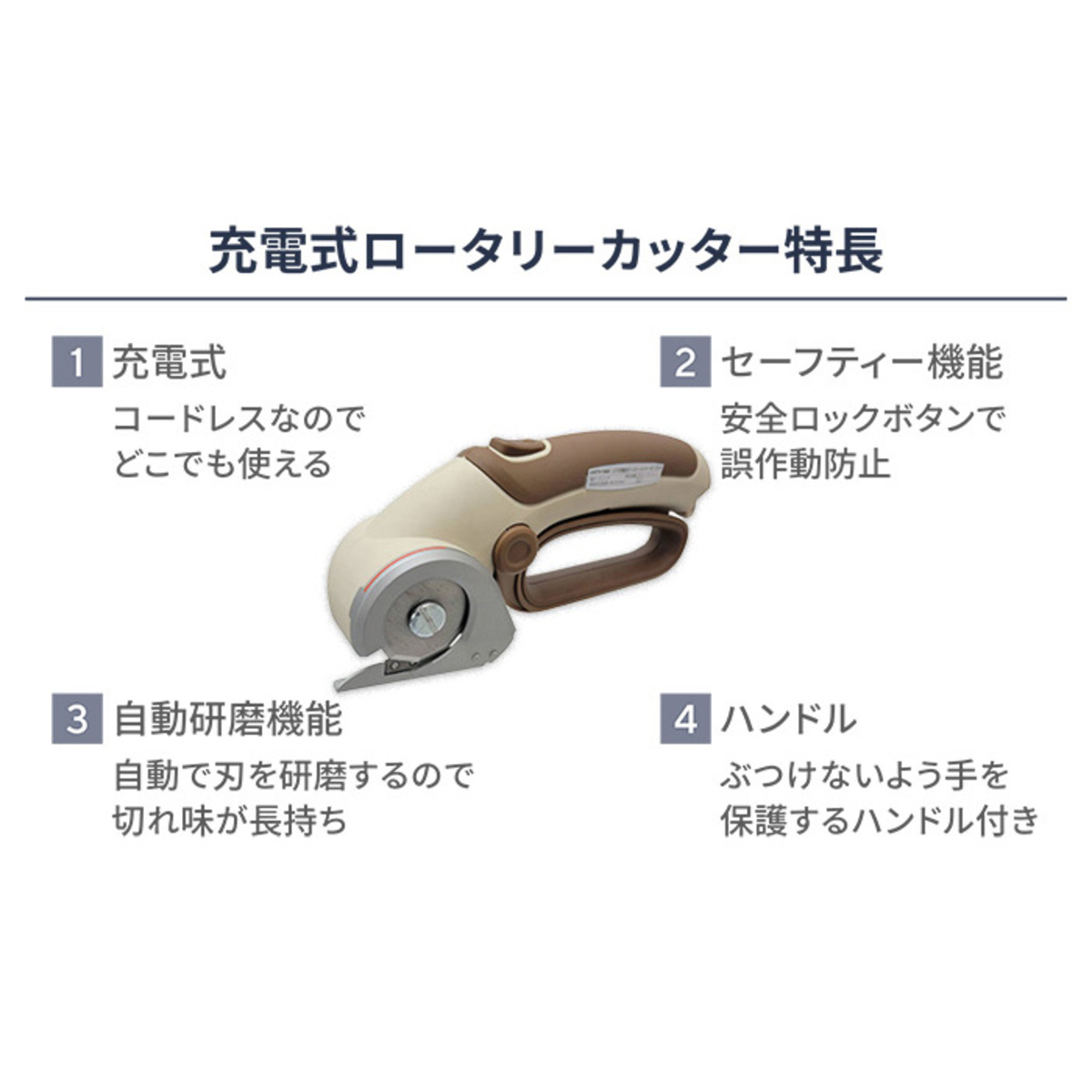 [商品内容] ・本体 ・充電用USBケーブル ※ACアダプターは付属しません [サイズ] 長さ22×幅5.3×高さ9.6cm ブレード直径4cm [重量] 約0.5kg [充電時間] 約5時間 [用途] 紙・プラスチック板・段ボール・ボール紙・革・カーペット・コットン・フェルト・ビニールシート・アルミ板等 [使用方法] 1、ハンドルを握りながら安全ロックボタンを押すと作動します。作動後は安全ロックボタンを離しても作動し続けます 2、本体を作動させた状態で、ブレードを材料に当て、ブレードの動きが遅くならない程度の速度でゆっくりと切り進めてください。本体に付いた目印が切断位置になります 3、ハンドルを離すと停止します [お手入れ] ・汚れの著しい場合は、ブラシで汚れを取り除き、水拭きして下さい。その後、乾いた布で水分が残らないように拭き取って下さい ・回転部に切りくずやごみ等が入らないように注意して下さい。入った場合は逆さにするなどしてごみを取り除いて下さい ・直射日光の当たらない・風通しの良い・乾燥した場所で、お子様の手の届かない安全な場所に保管して下さい ・ご自身で分解・改造・修理をしないで下さい ・長期間(6か月以上)使用しない場合は、満充電にして保管して下さい [注意事項] ※ACアダプターは付属しません ※使用中は、本体を確実に保持して下さい ※使用中は、作動部に手や顔を近づけないで下さい(けがの原因) ※安全ロックボタンを押した状態で固定しないで下さい。セーフティー機構が働かず、けがの原因になります ※1m以上の高さから落下させたり、強い衝撃を与えた場合は直ちにその使用を中止すること ※火中・水中に入れないこと ※雨や水に濡らさないこと ※高温となる環境で充電や保管をしないこと 例:直射日光が当たる場所や車中 ※足元の不安定な場所や無理な姿勢で使用しないこと ※モーターがロックしたり、回転が極端に落ちるような使い方をしないこと ■取り扱い説明を充分にご確認の上、ご使用下さい 【中国製】