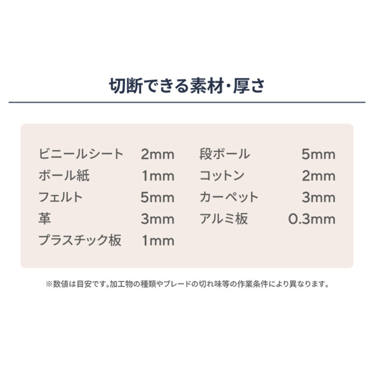 *切断能力:フェルト:5mm/革:3mm/カーペット(ニードルパンチ):3mm/コットン:2mm/段ボール:5mm/ビニールシート:2mm/ボール紙:1mm/プラスチック板:1mm/アルミ板:0.3mm