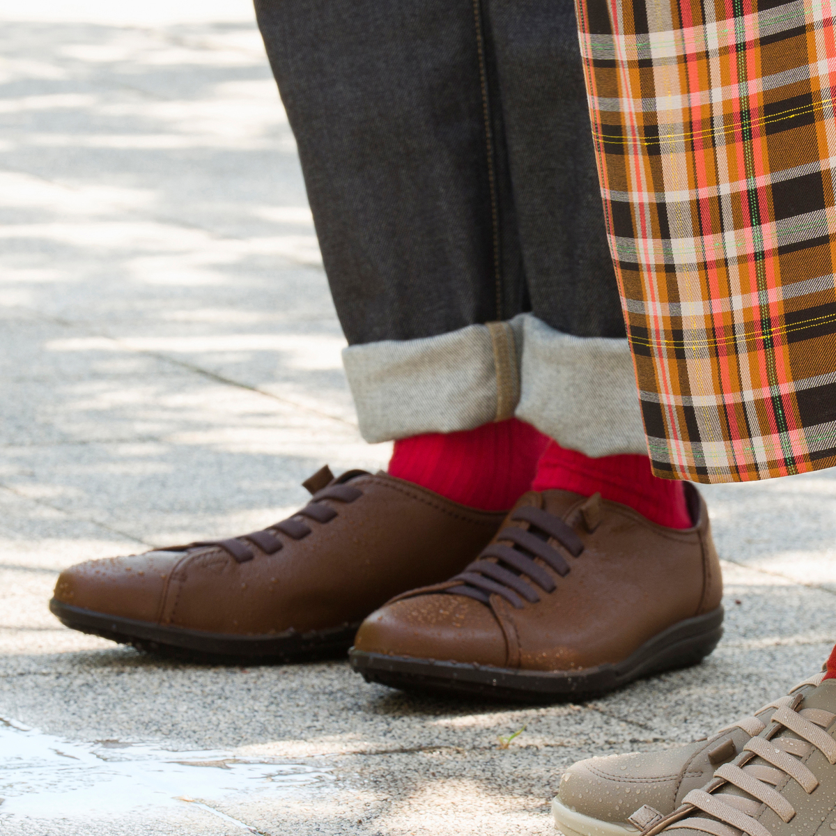 主人の誕生日プレゼントにしようとブラウン 購入しました。先日鎌倉に出かけた時に おろして、いきなり15000歩歩きましたが、3Eで見ためも細みで大丈夫かなと心配して いましたが、痛くなることも無く、疲れも無く快適だったようです。良いお品でした。