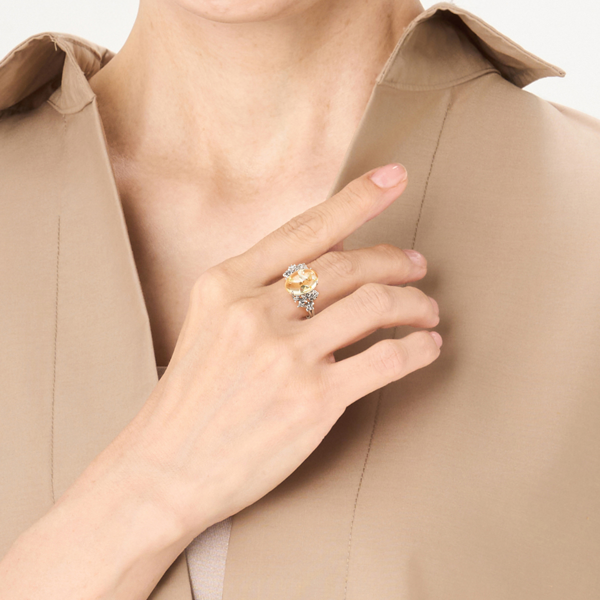 ウィリアムモリスのデザインした、やぐるまぎくがモチーフのリング。舞うような動きのある、やぐるまぎくのテキスタイルをセンターストーンの両サイドに置いた、シンメトリーなデザインです
