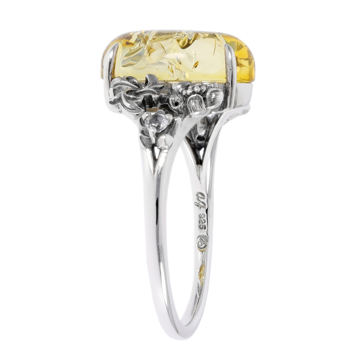 きれいなレモンカラーのコハクとナチュラルストーン*を合わせました。花や葉の勢いのあるのびのびとした線使いに対して、小さな花や葉の舞い散る様子に可愛らしさがあるコントラストが魅力です