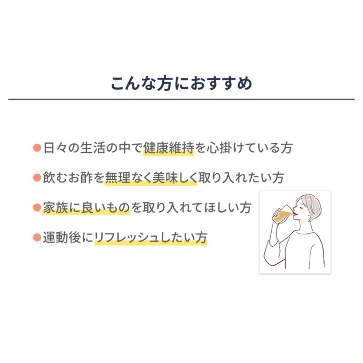 フルーティーで、ツンとしないまろやかな酸味が特徴の健康酢です。オリゴ糖やはちみつなどを加えておいしく飲みやすい味に仕上げました。※味の感じ方には個人差があります。