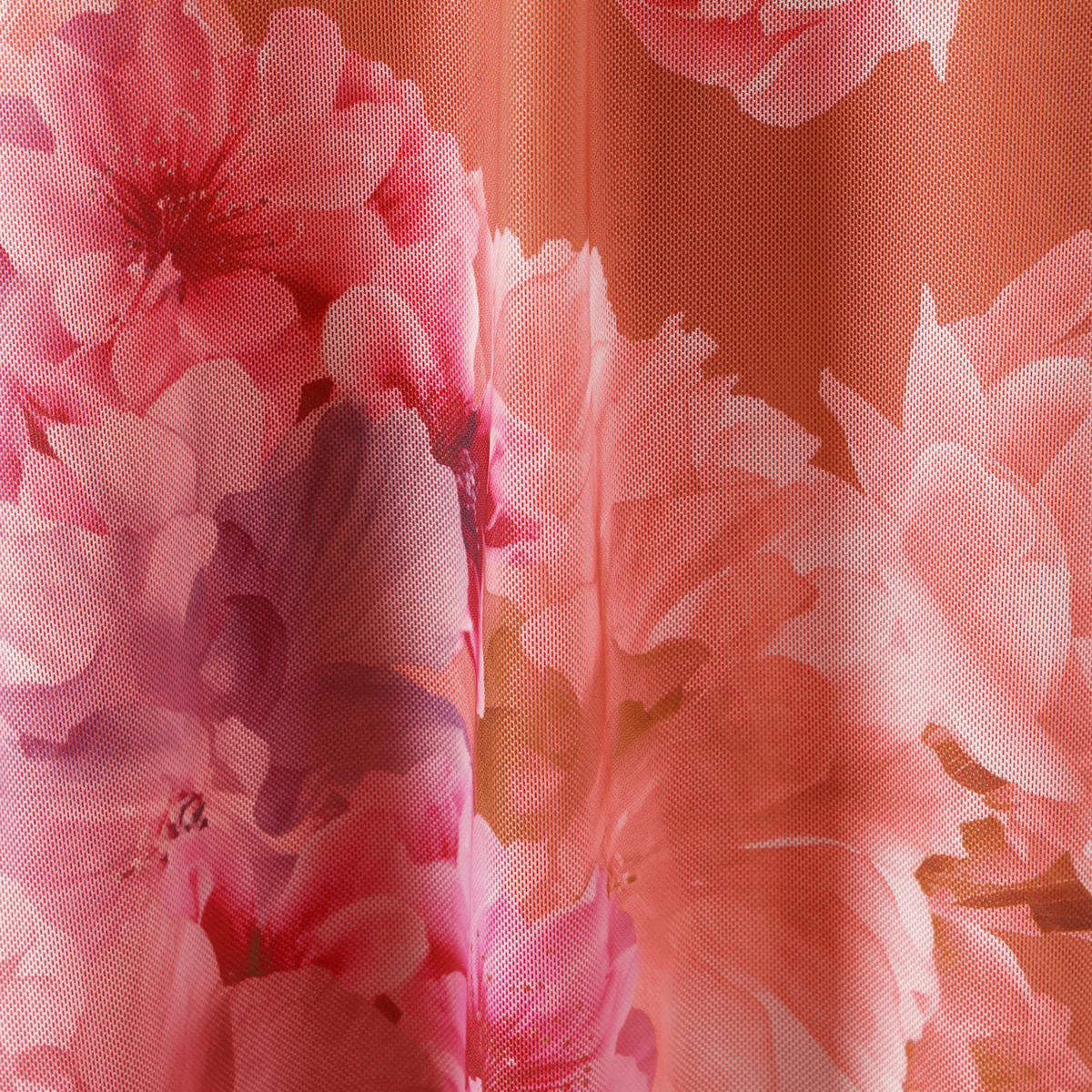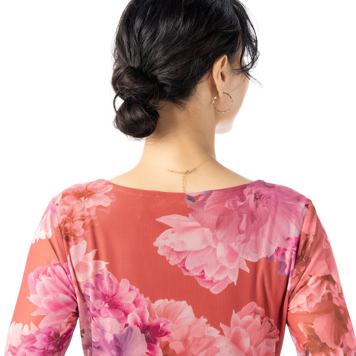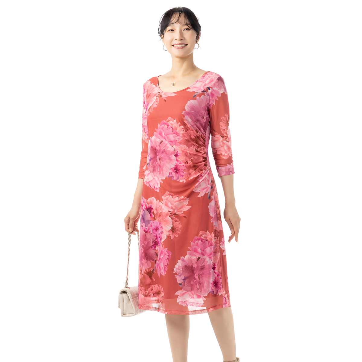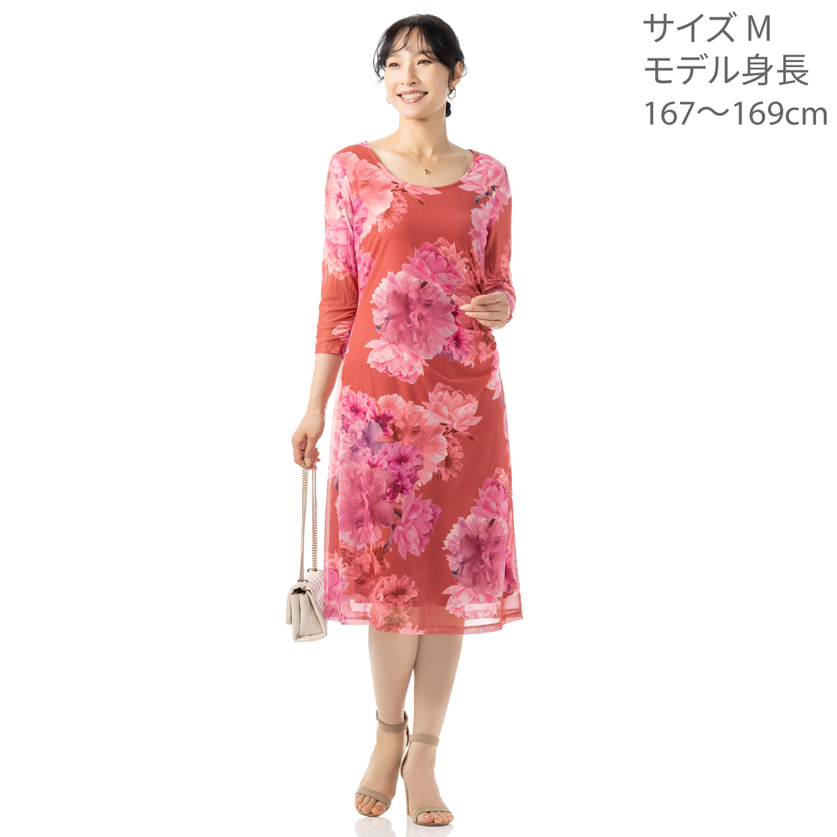 メッシュのシアー感と華やかなプリントが特徴のワンピース。1枚着るだけでエレガントに決まるアイテムです