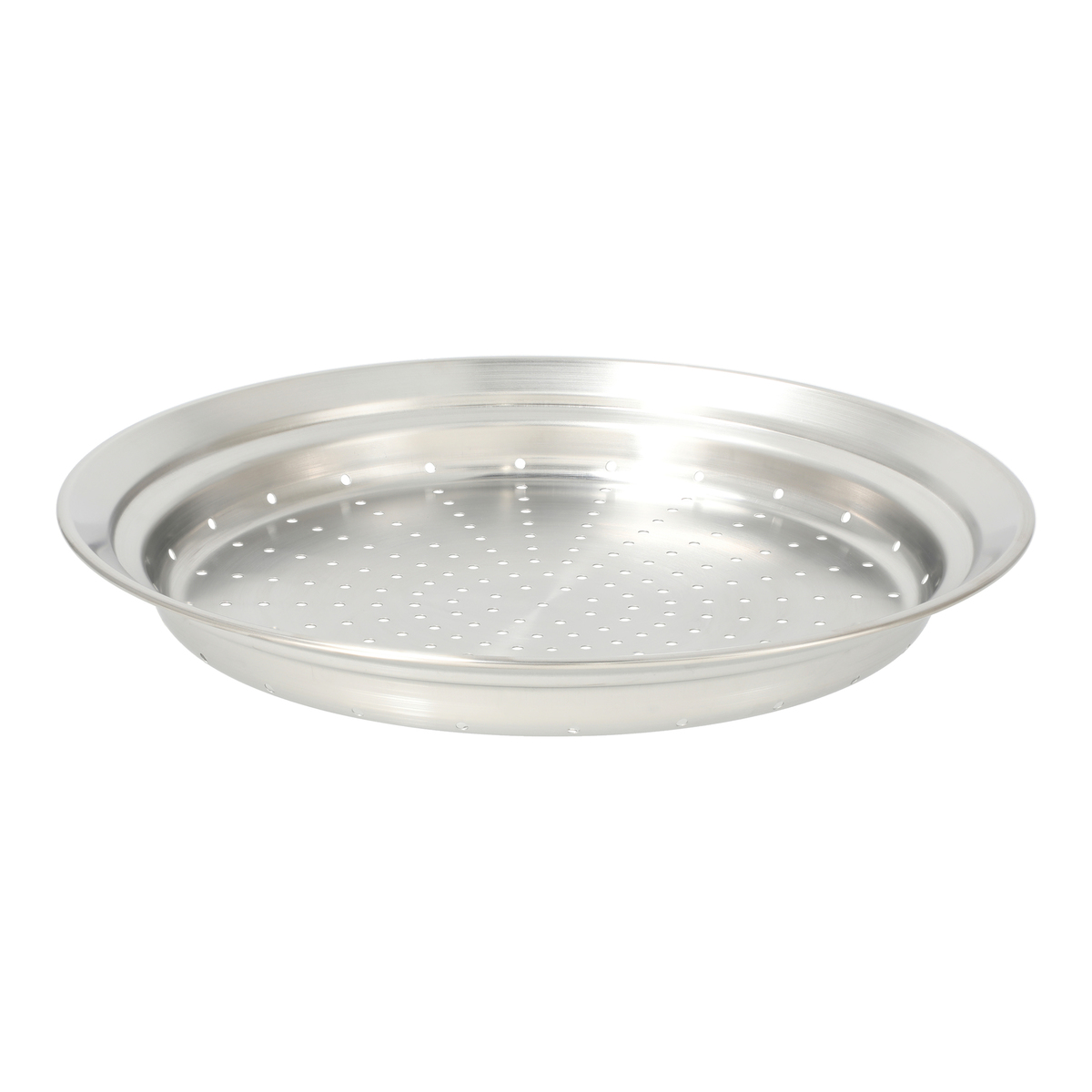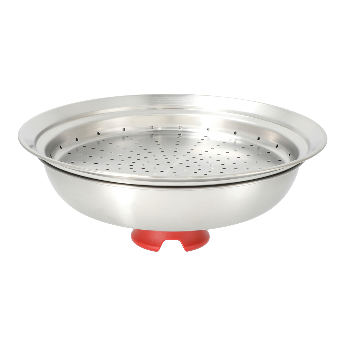 お手持ちの24〜26cmのフライパンや鍋に合わせて使えるステンレス製*のスチーマー。均一に蒸気穴があるので下からの蒸気がまんべんなく食材に当たります。またドーム型の蓋が加熱蒸気を対流させ、ふっくらしっとりと調理できます