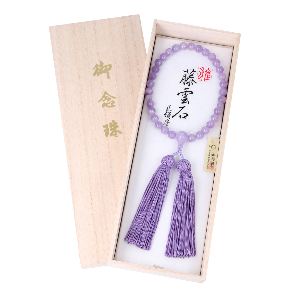 落ち着いた藤色が美しい念珠。房を含めて上品な色で統一したデザインは、年代を問わずお使いいただけます。保管にも適した桐箱でお届けします