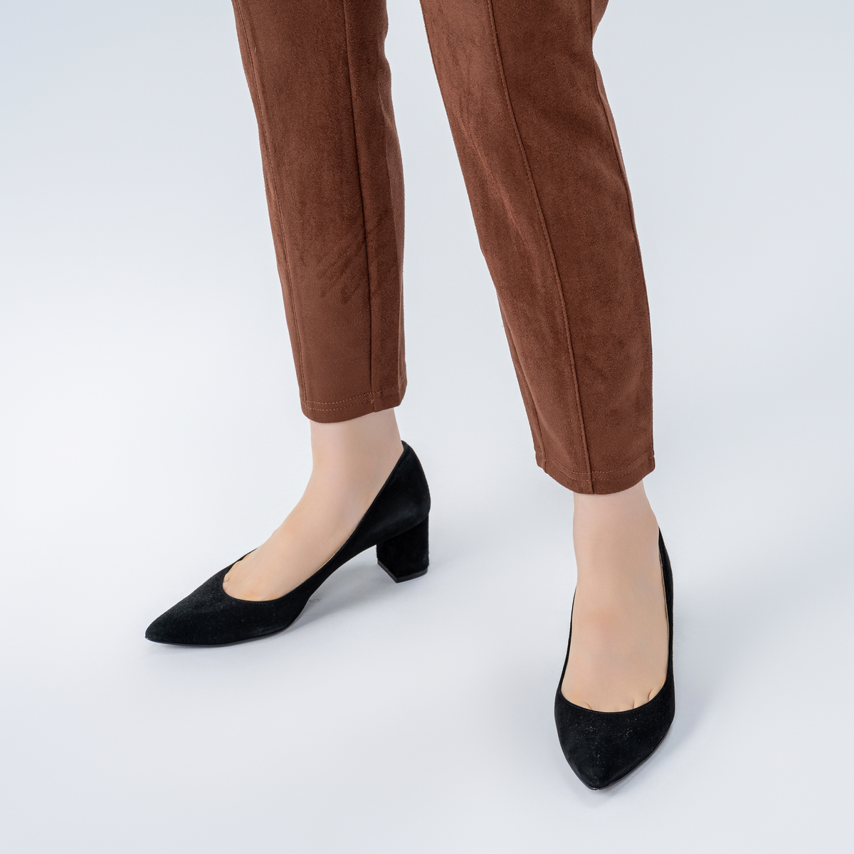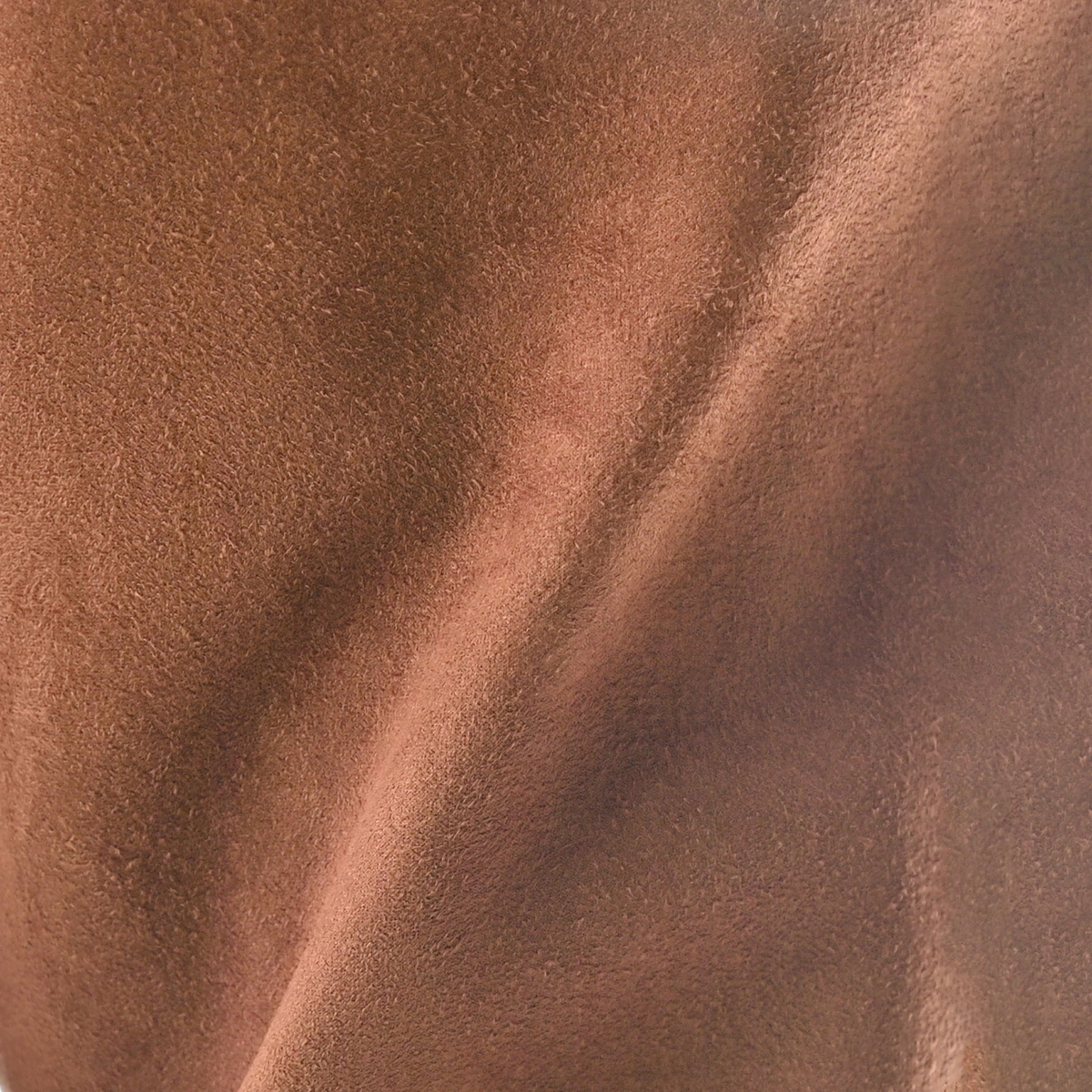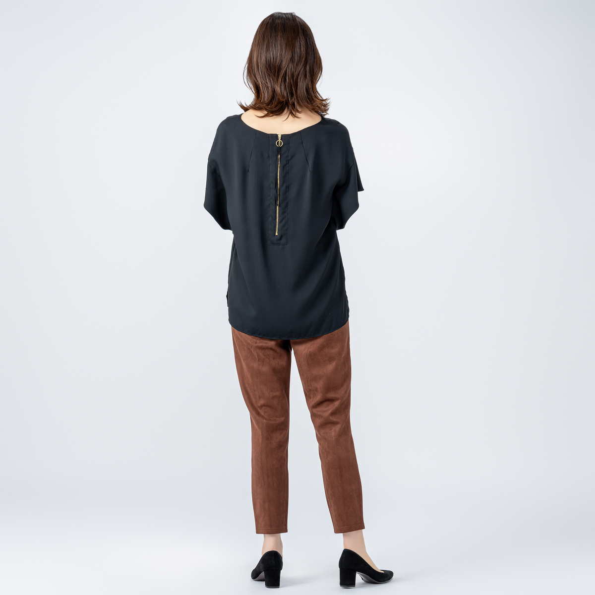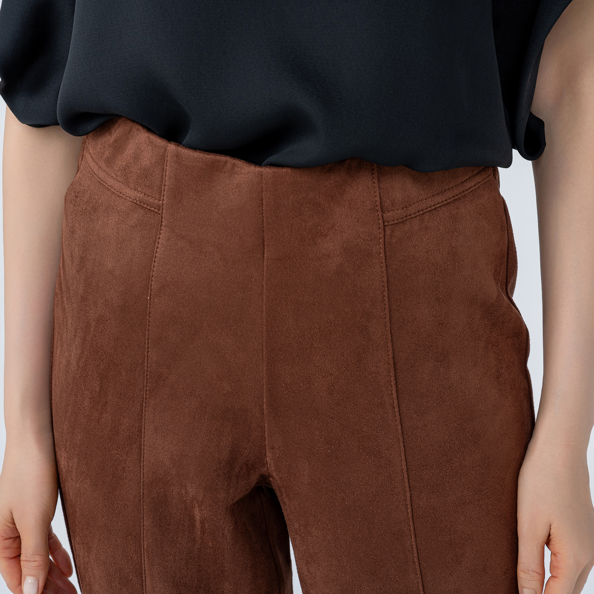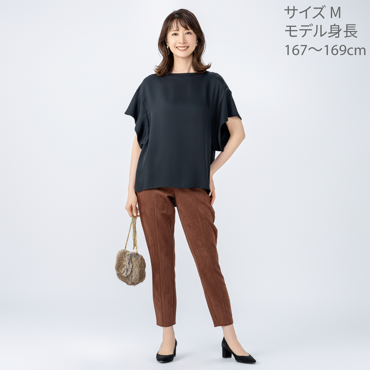生地にフェイクスウェードを使ったスリムパンツ。全体はセミフィットシルエットで、ウエストゴムのプルオンタイプ。引っ張って穿くだけで着脱ラクチンながら、カッコよく綺麗見えするシルエットです。後ろ左右にはパッチポケットを付けました