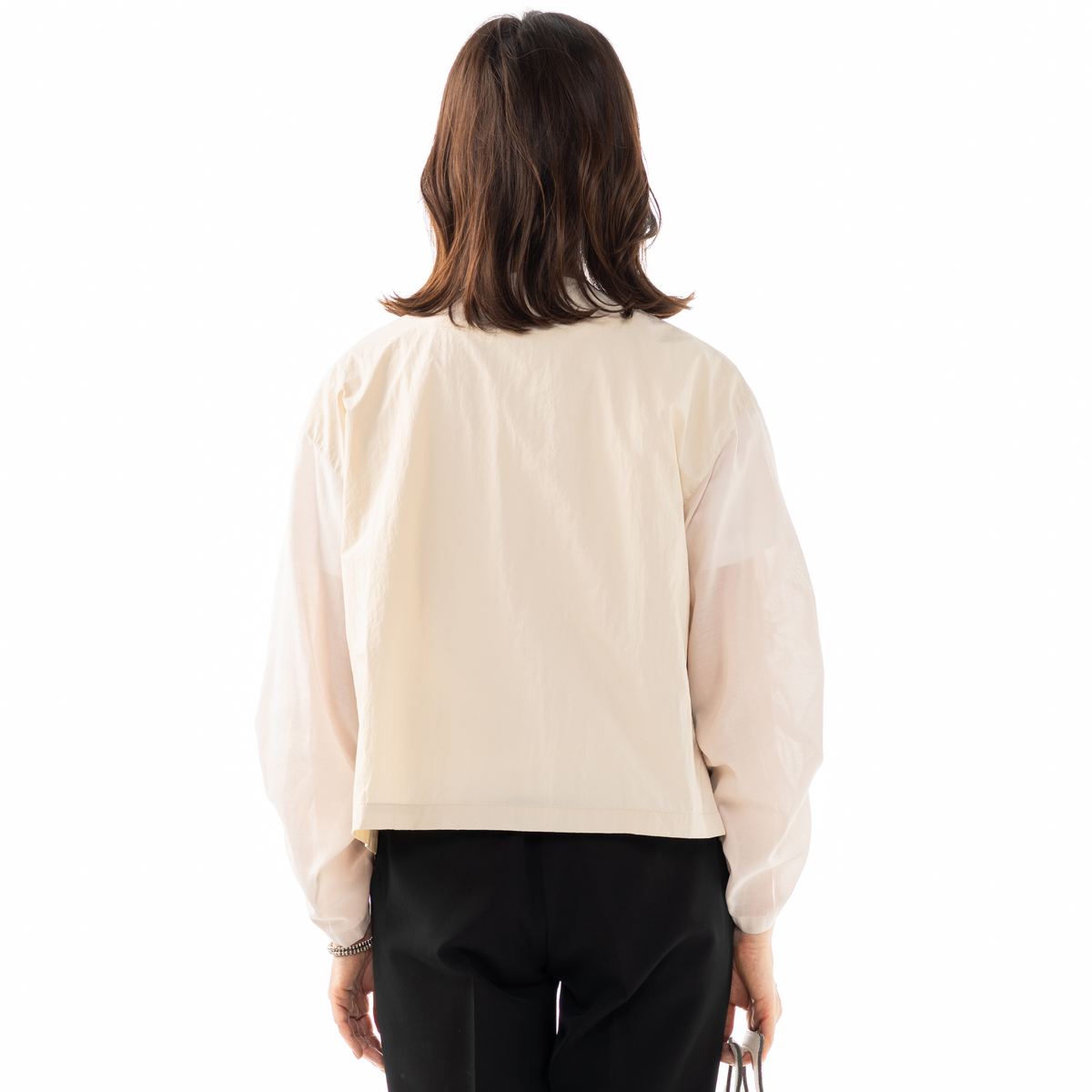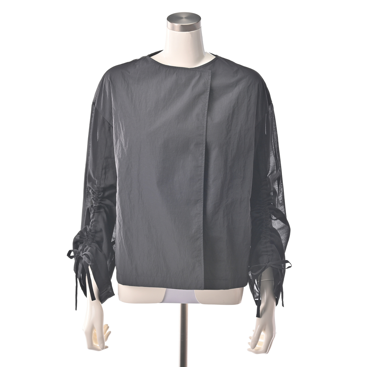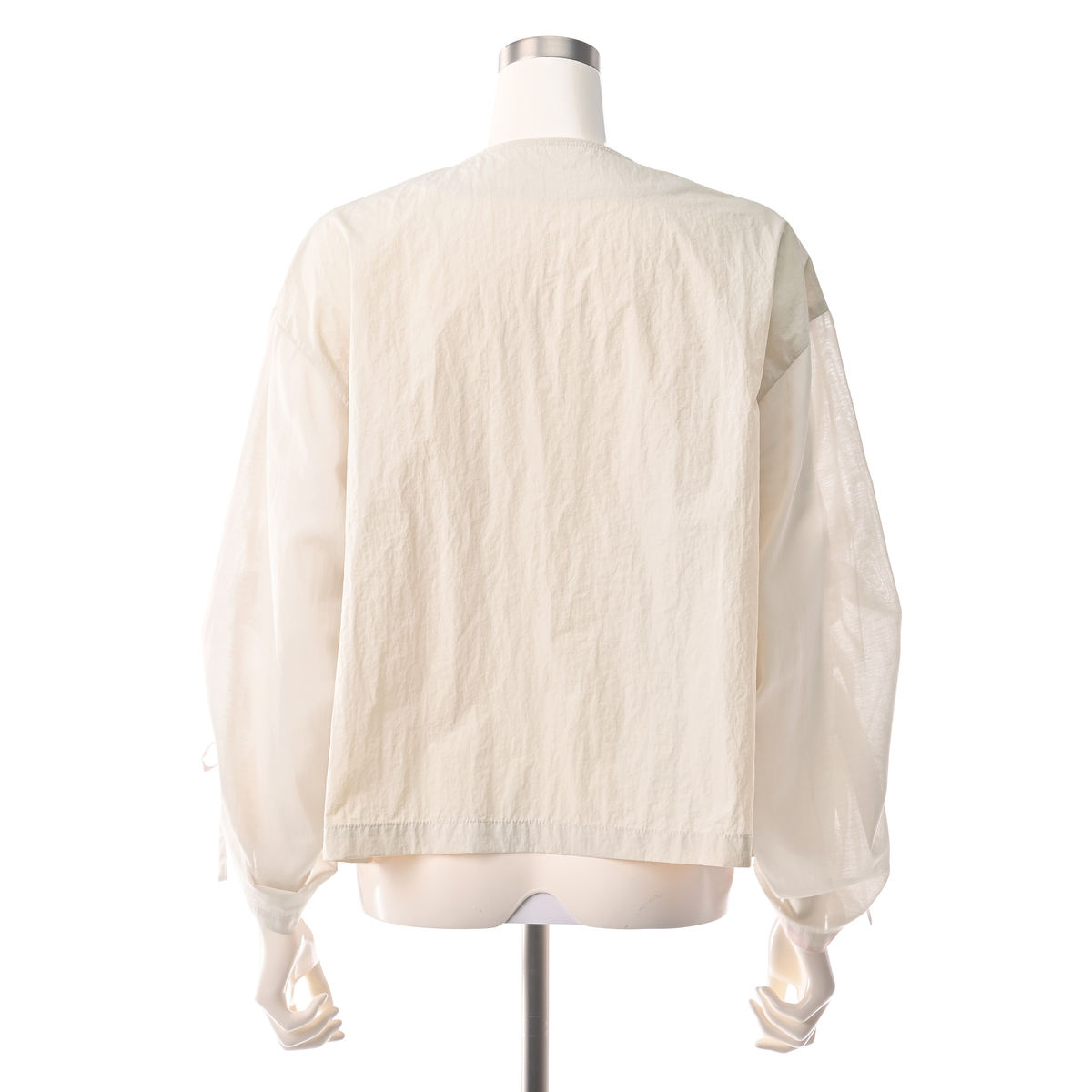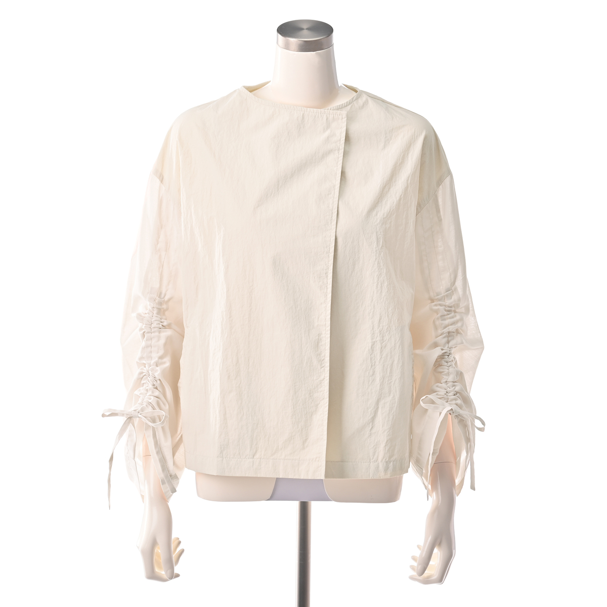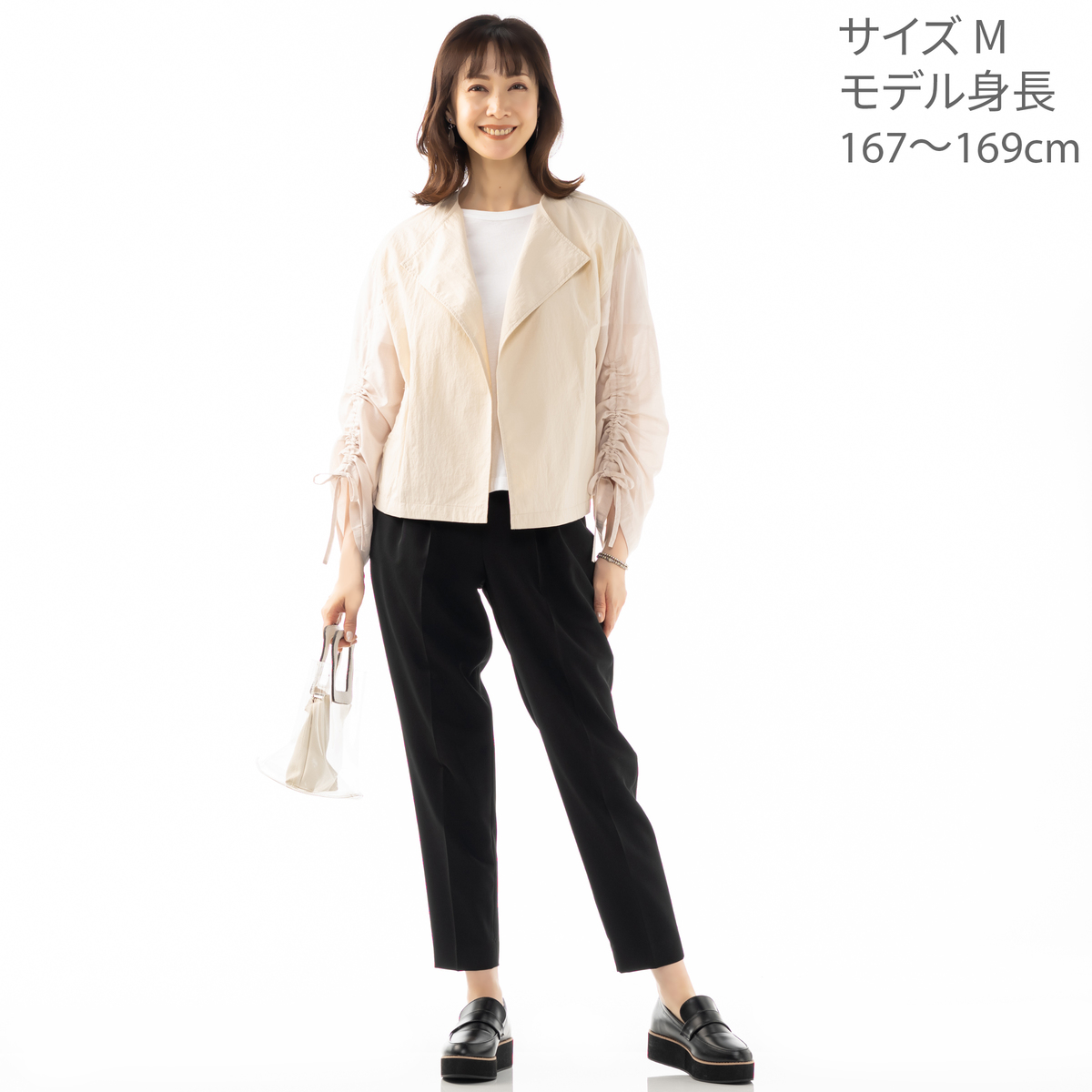 袖のギャザーが華やかなジャケットです。ノーカラーのすっきりとしたデザイン。軽い素材で仕立て、袖のたっぷりとしたドロストデザインが、旬な着こなしを叶えます