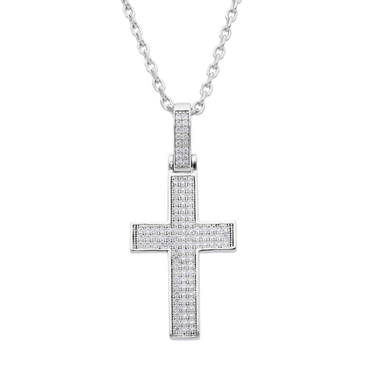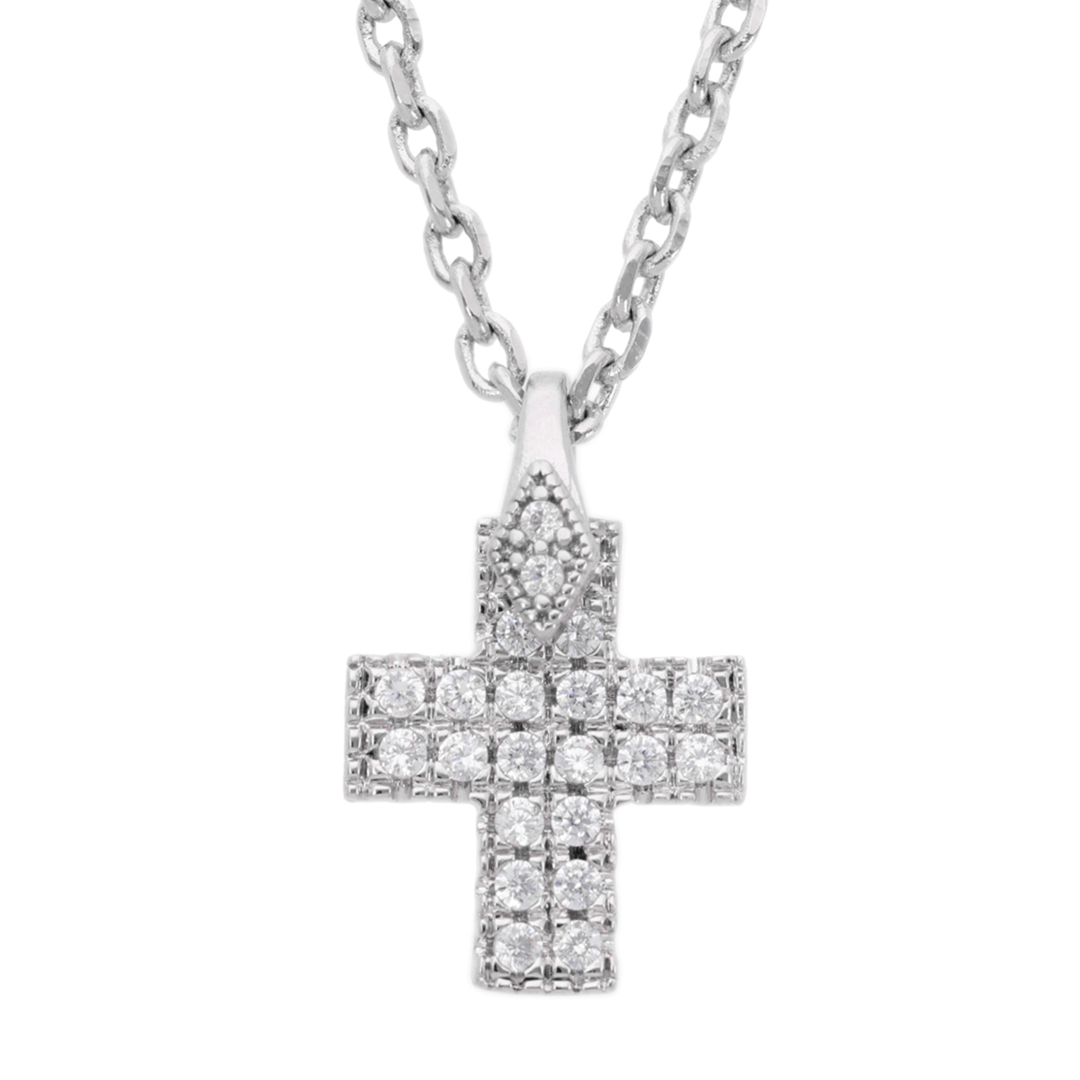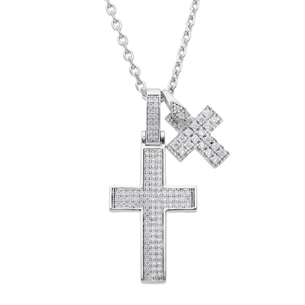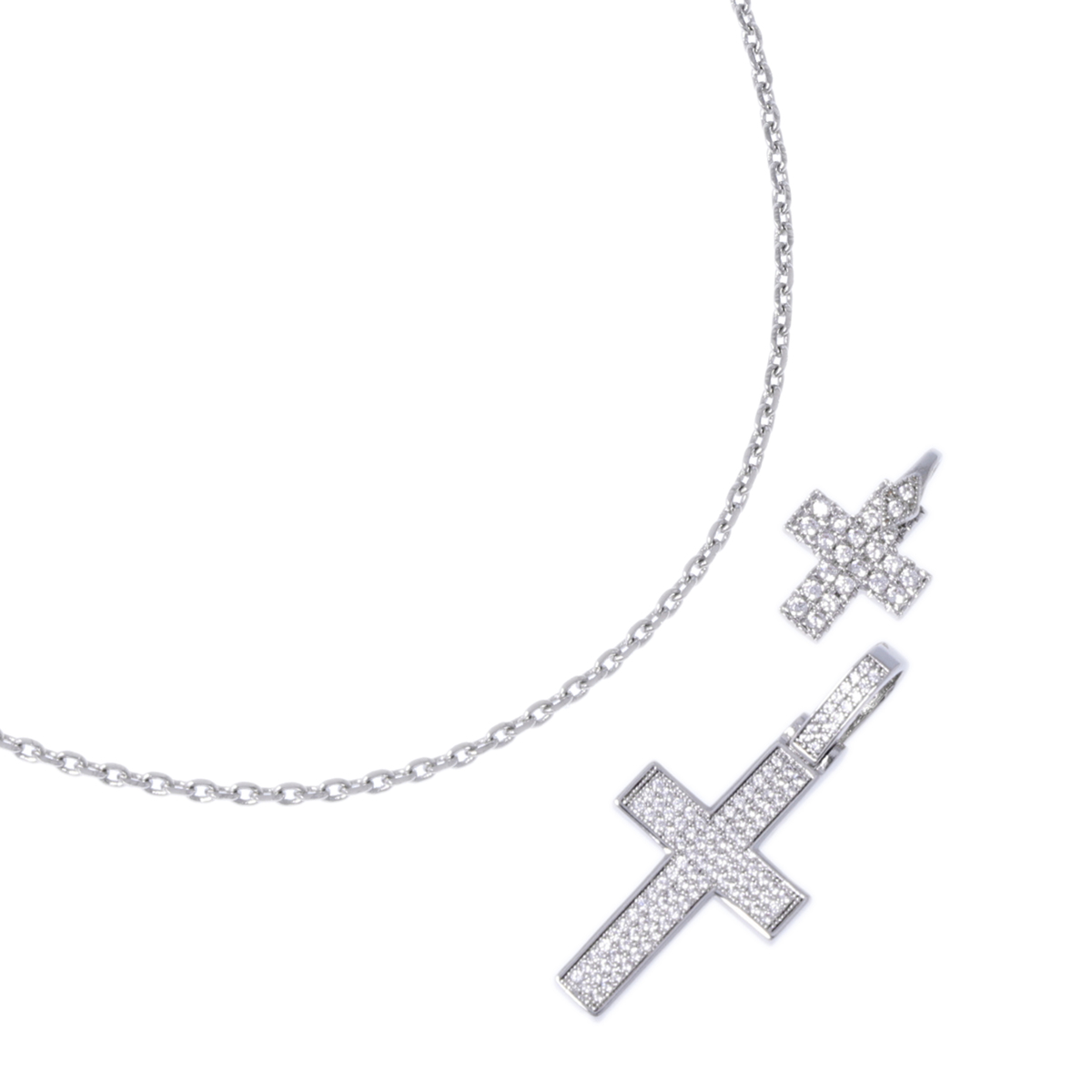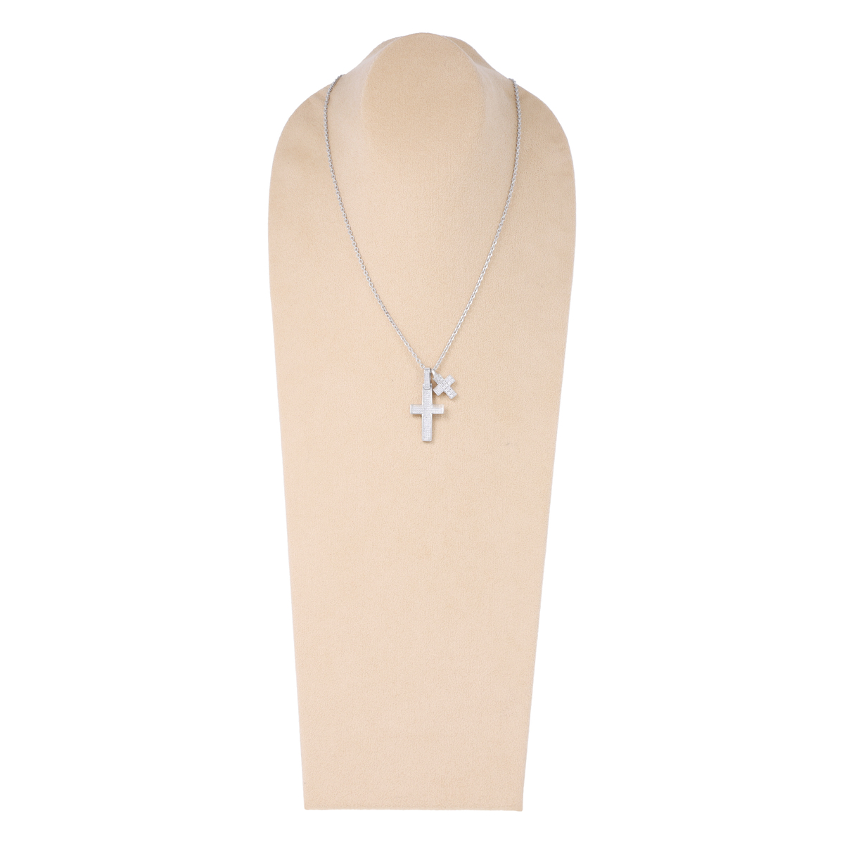 シンプルなチェーンに、大小2種類のクロスモチーフのペンダントヘッドを組合せたネックレスです。大きい方にはキュービックジルコニアを、小さい方にはガラスを一面に敷き詰めて、上品に煌めくネックレスに仕上げました