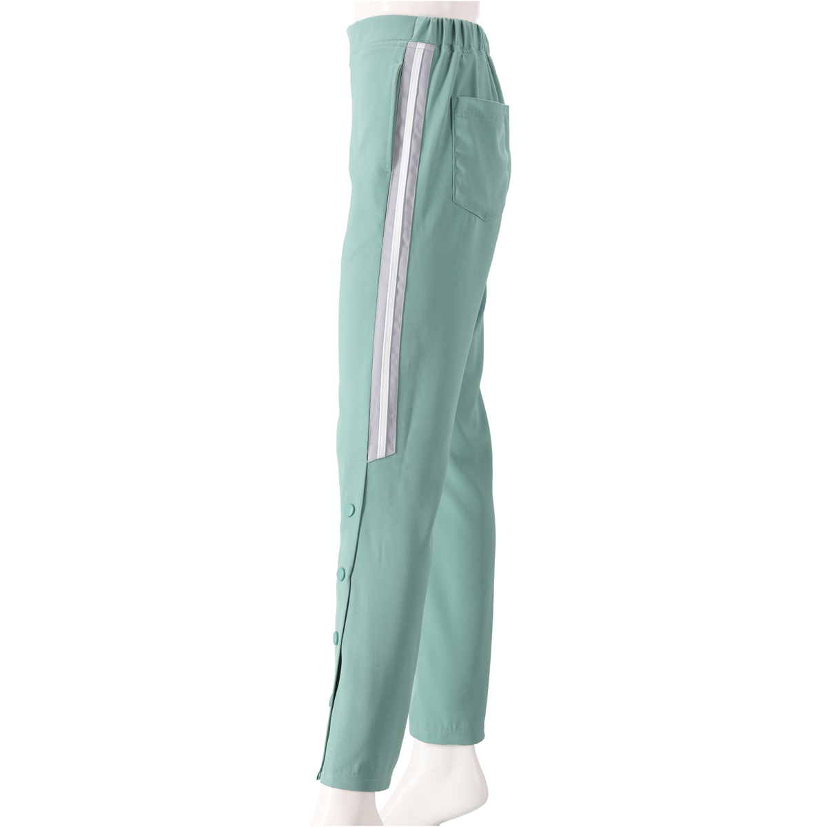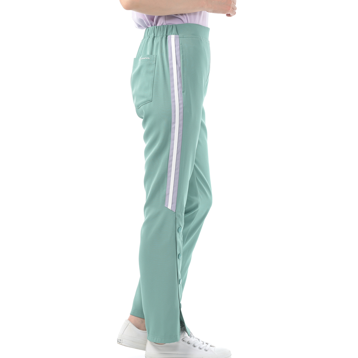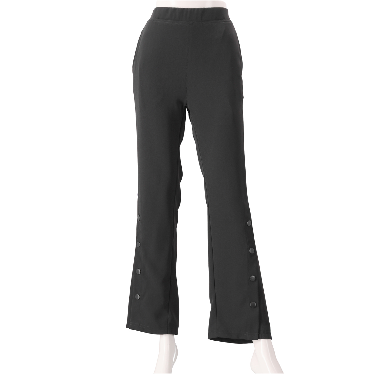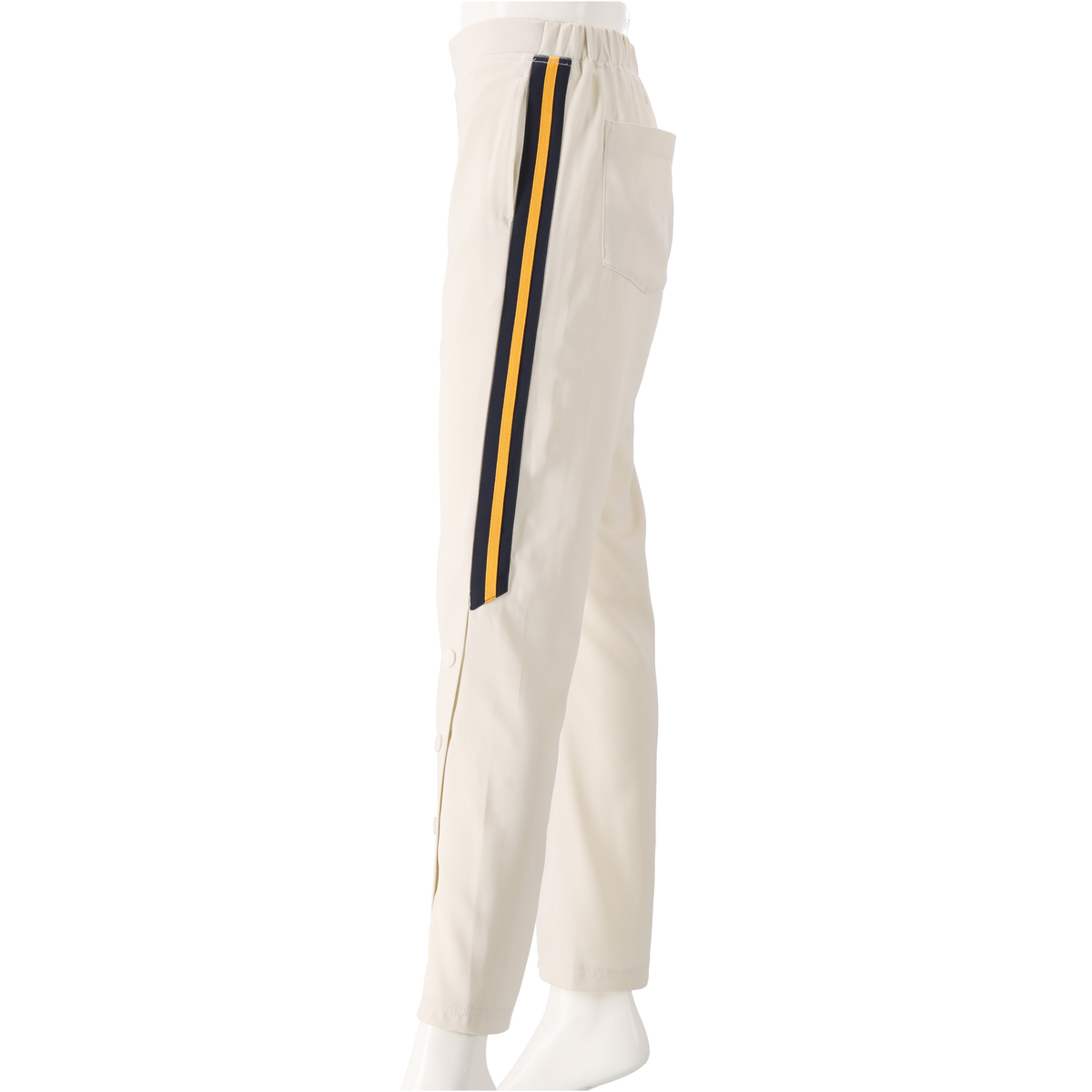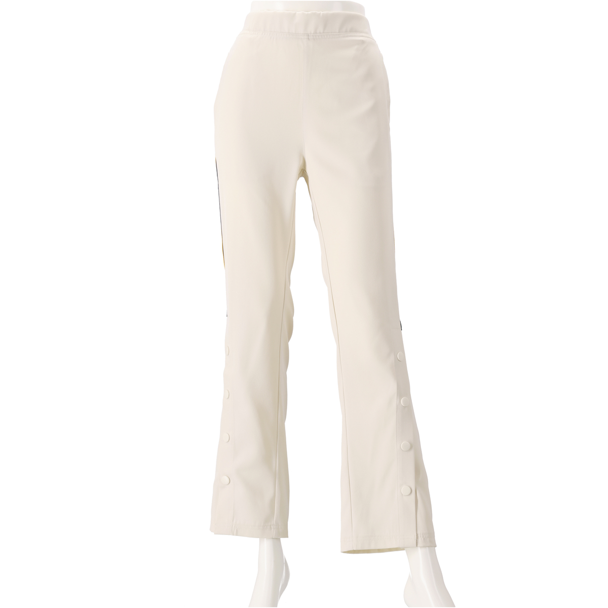 スナップボタン開きの裾デザインと脇の配色ラインが縦ラインを強調し、脚長効果が期待できるパンツです。膝から裾にかけて少し広がったセミブーツカットシルエット。ヒップポケットには配色ラインと色を合わせたロゴ刺繍を入れています