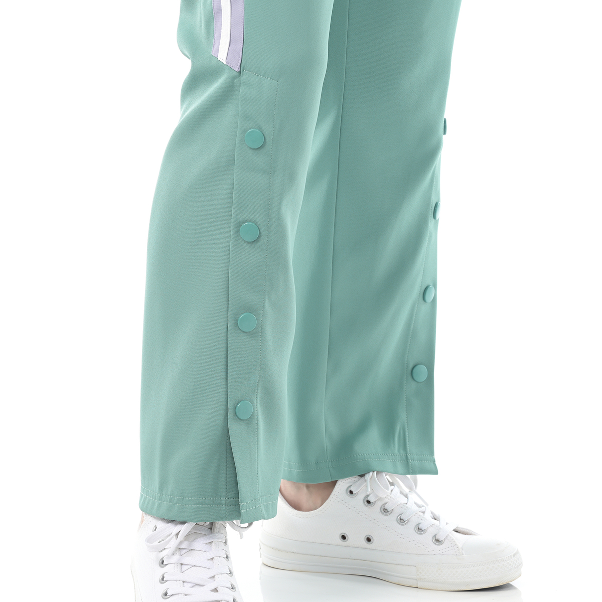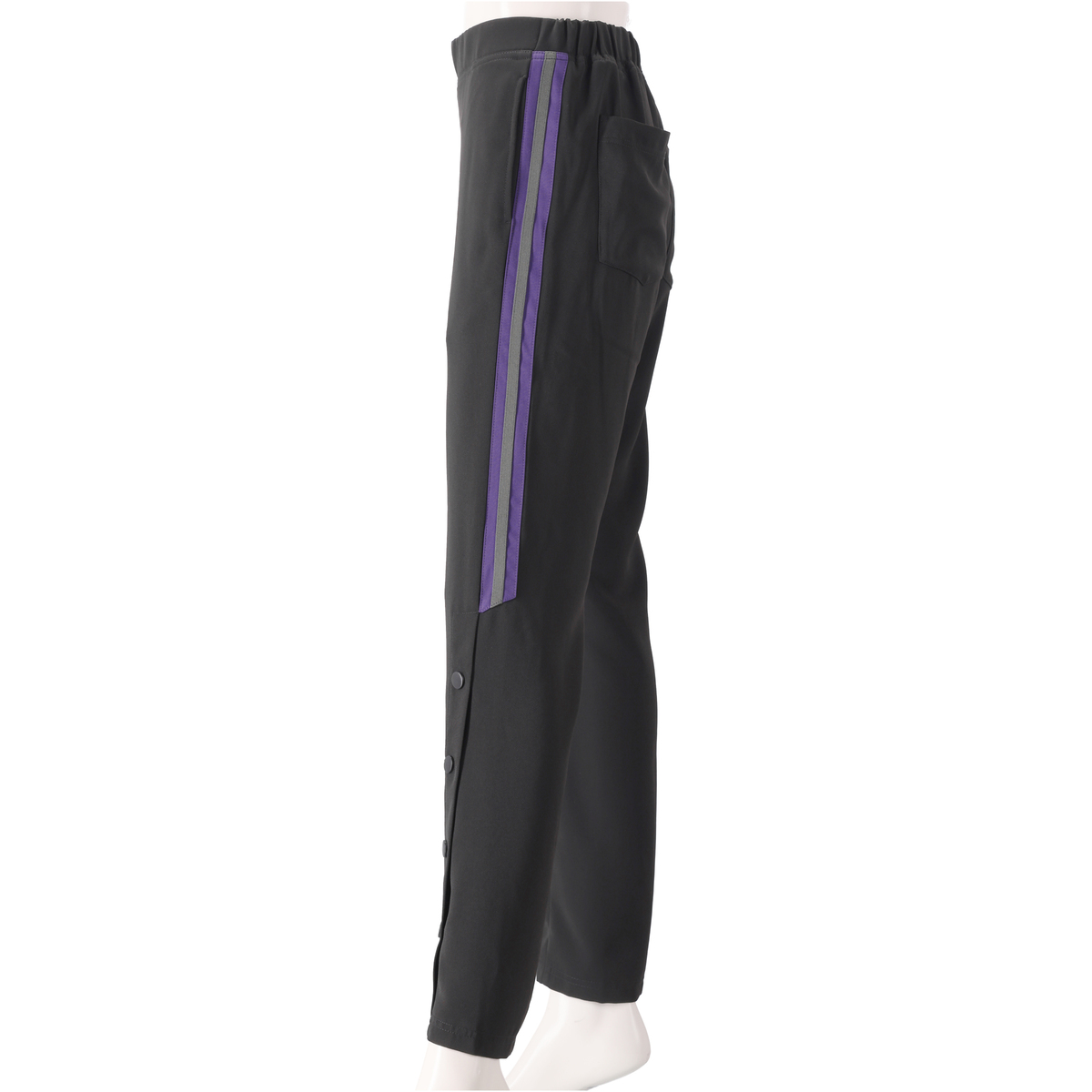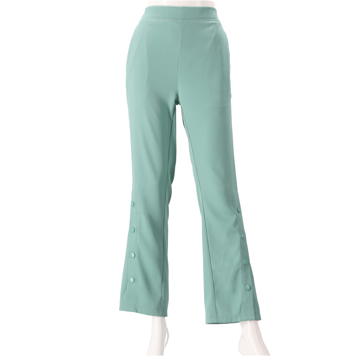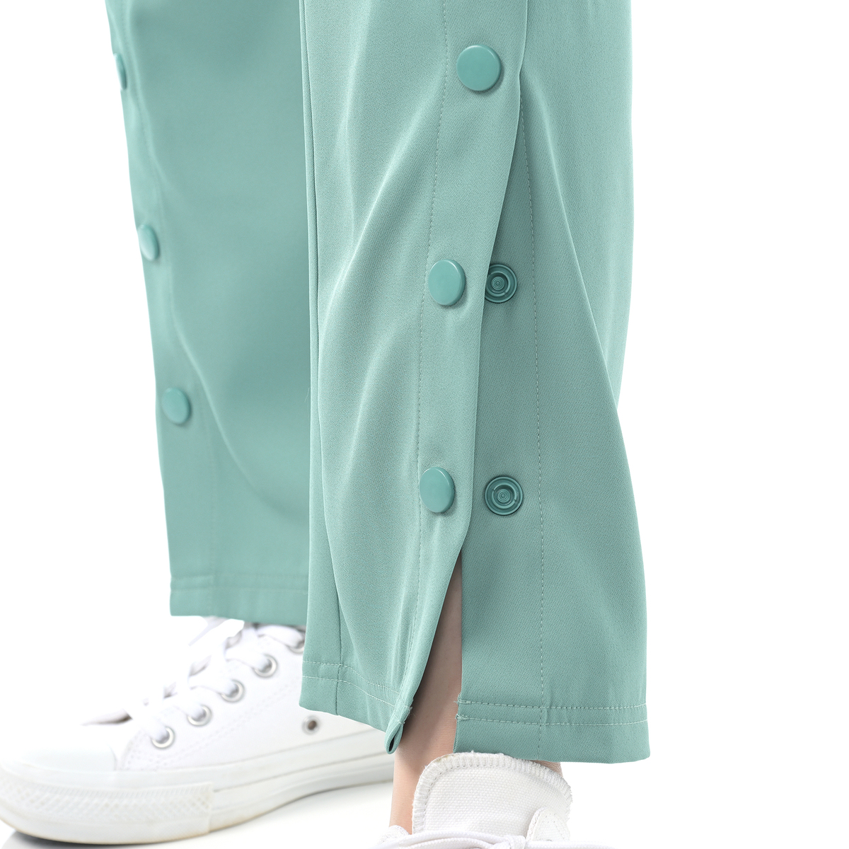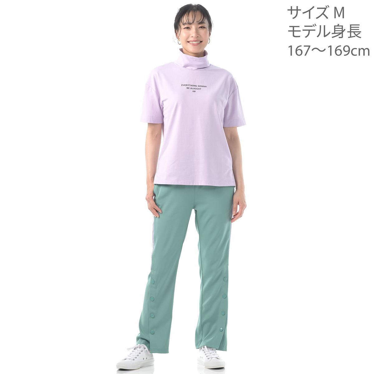 スナップボタン開きの裾デザインと脇の配色ラインが縦ラインを強調し、脚長効果が期待できるパンツです。膝から裾にかけて少し広がったセミブーツカットシルエット。ヒップポケットには配色ラインと色を合わせたロゴ刺繍を入れています