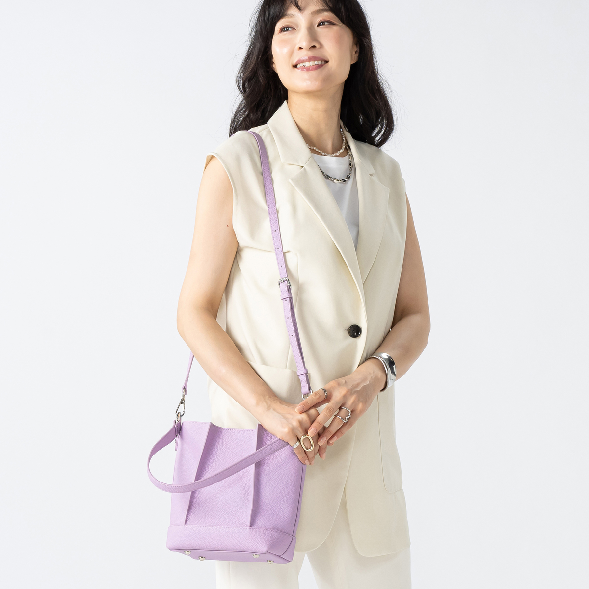 キズがつきにくくシワになりにくい、表面に凹凸のあるシュリンクレザーを使用。きれいなドレープでアウトシームデザインの2WAYショルダーバッグです。着脱可能なショルダーストラップ付き。デイリーユースはもちろん、ご旅行などにも活躍してくれます
