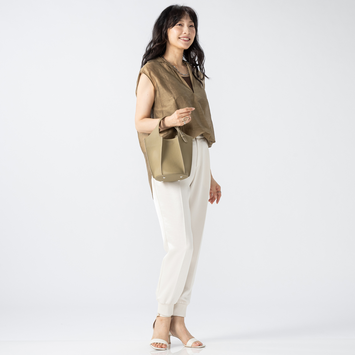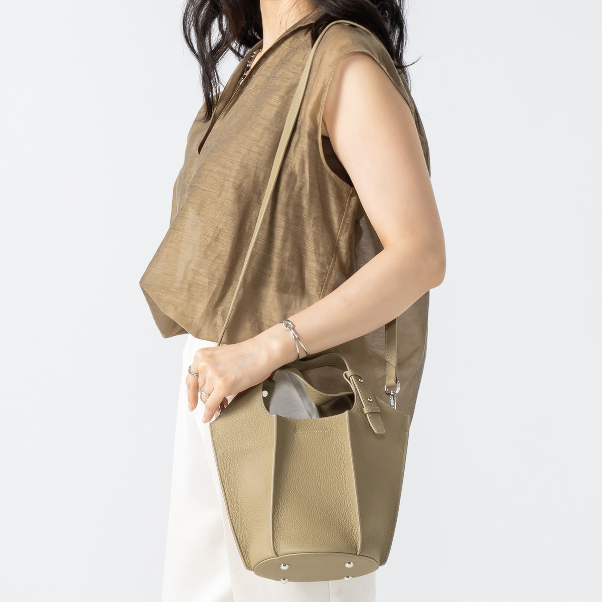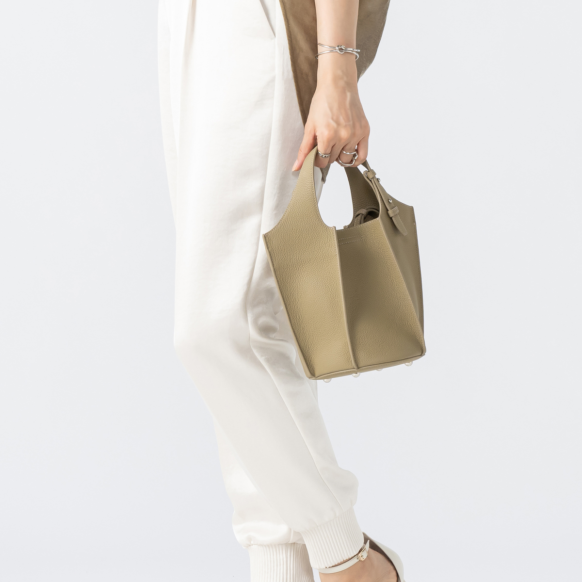 きれいなドレープでアウトシームデザインの2WAYバケツバッグです。着脱可能なショルダーストラップ付き。デイリーユースはもちろん、ご旅行などにも活躍してくれます