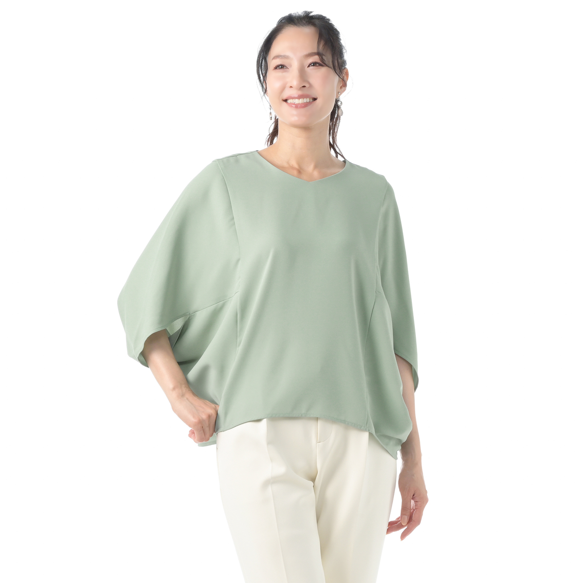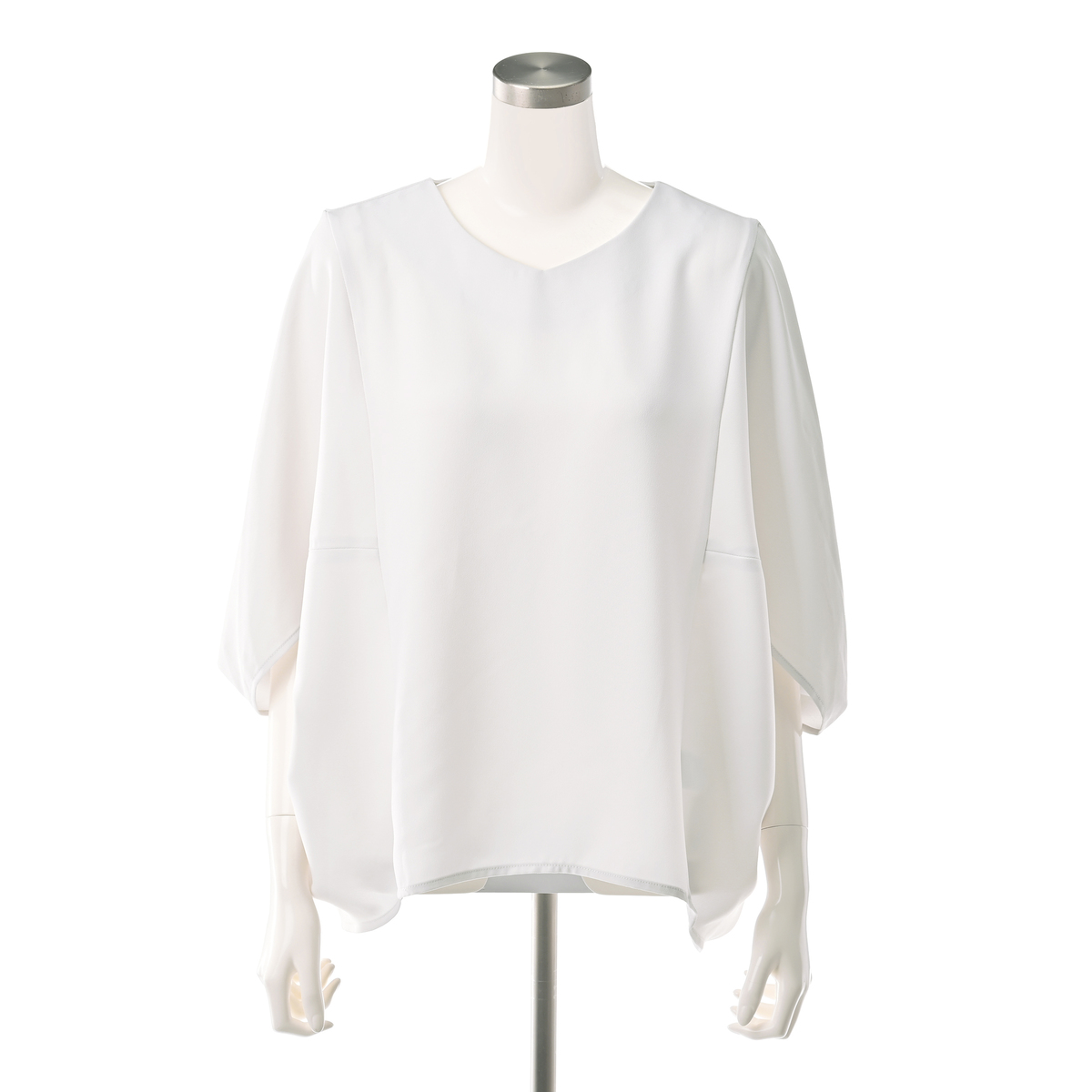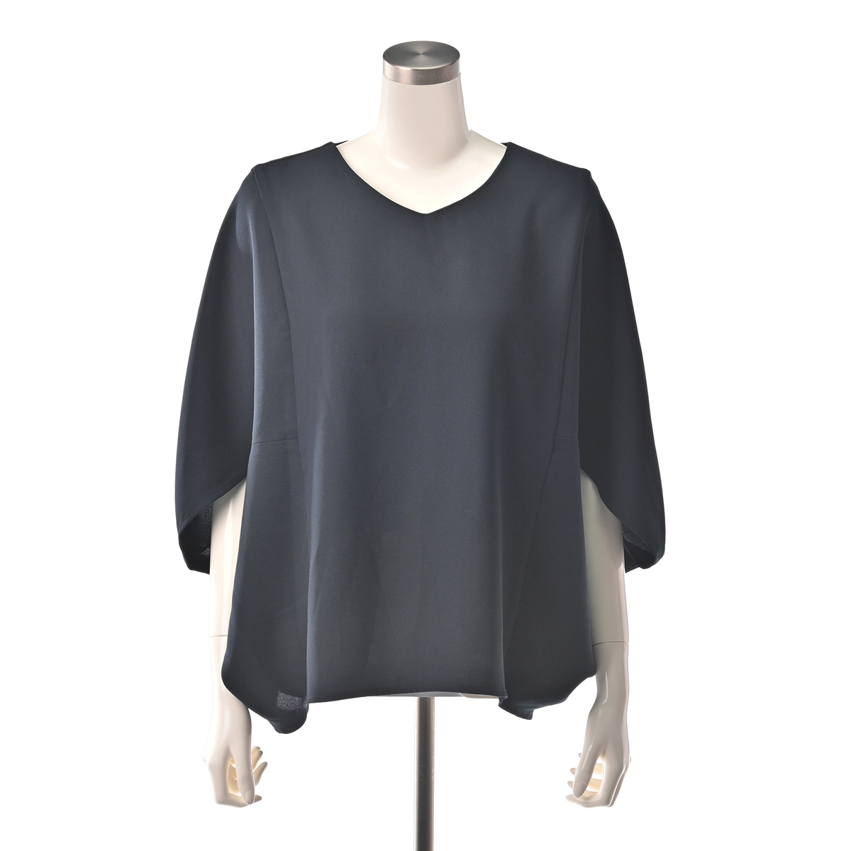 ドレープが上半身全体を包み込むシルエットのマントブラウス。上品な大人のスタイリングを演出します