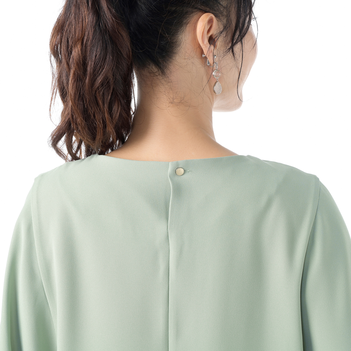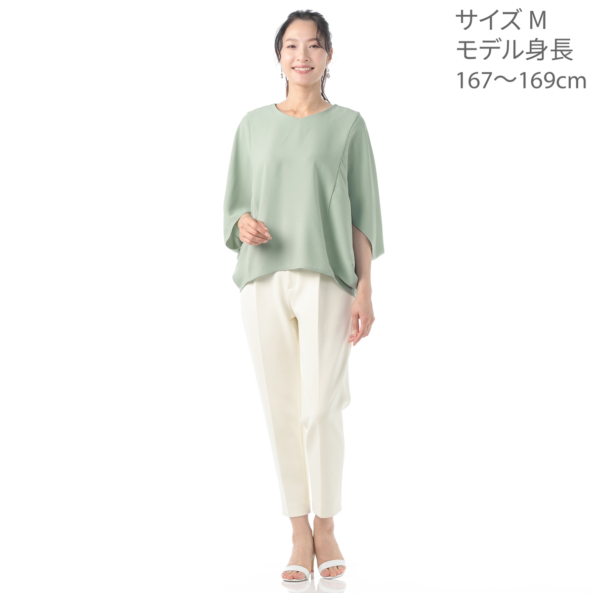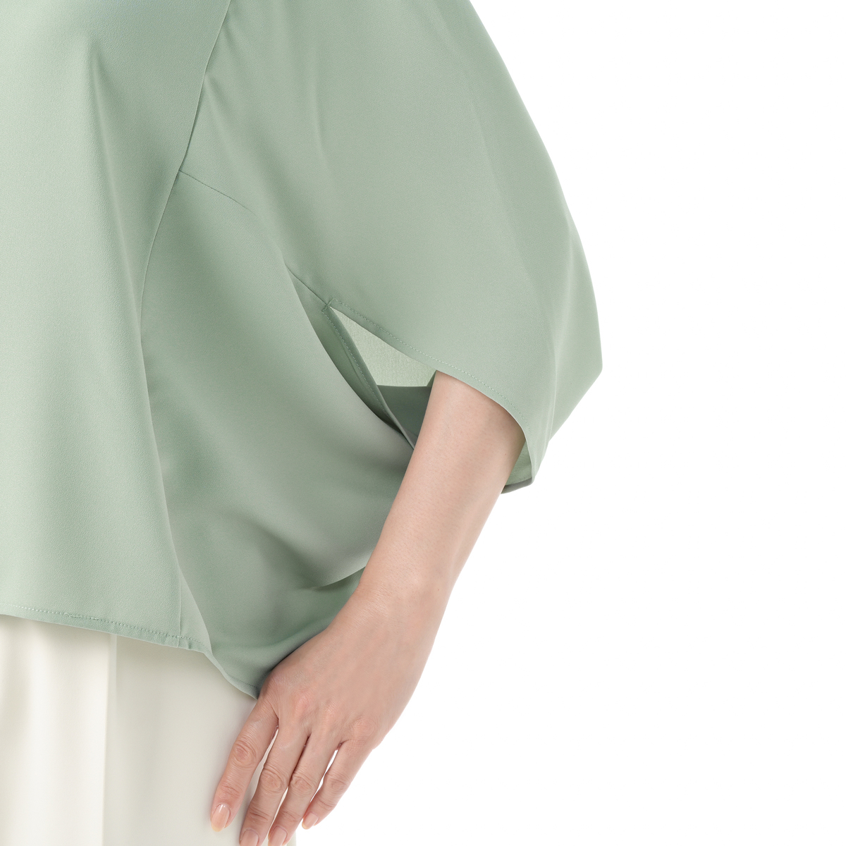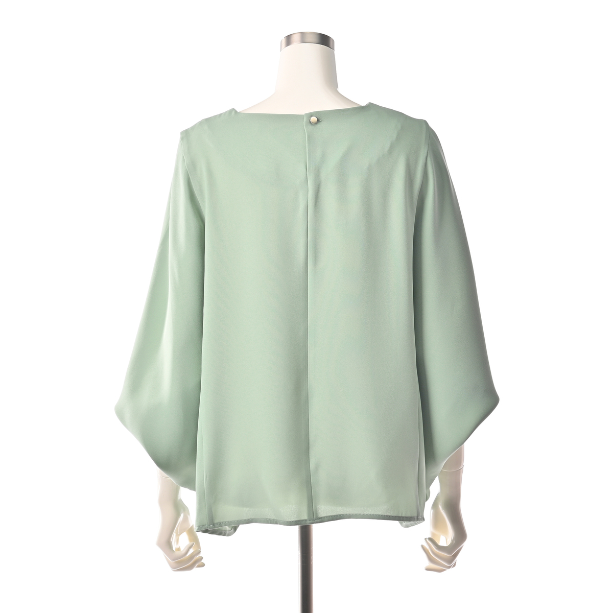 ドレープが上半身全体を包み込むシルエットのマントブラウス。上品な大人のスタイリングを演出します
