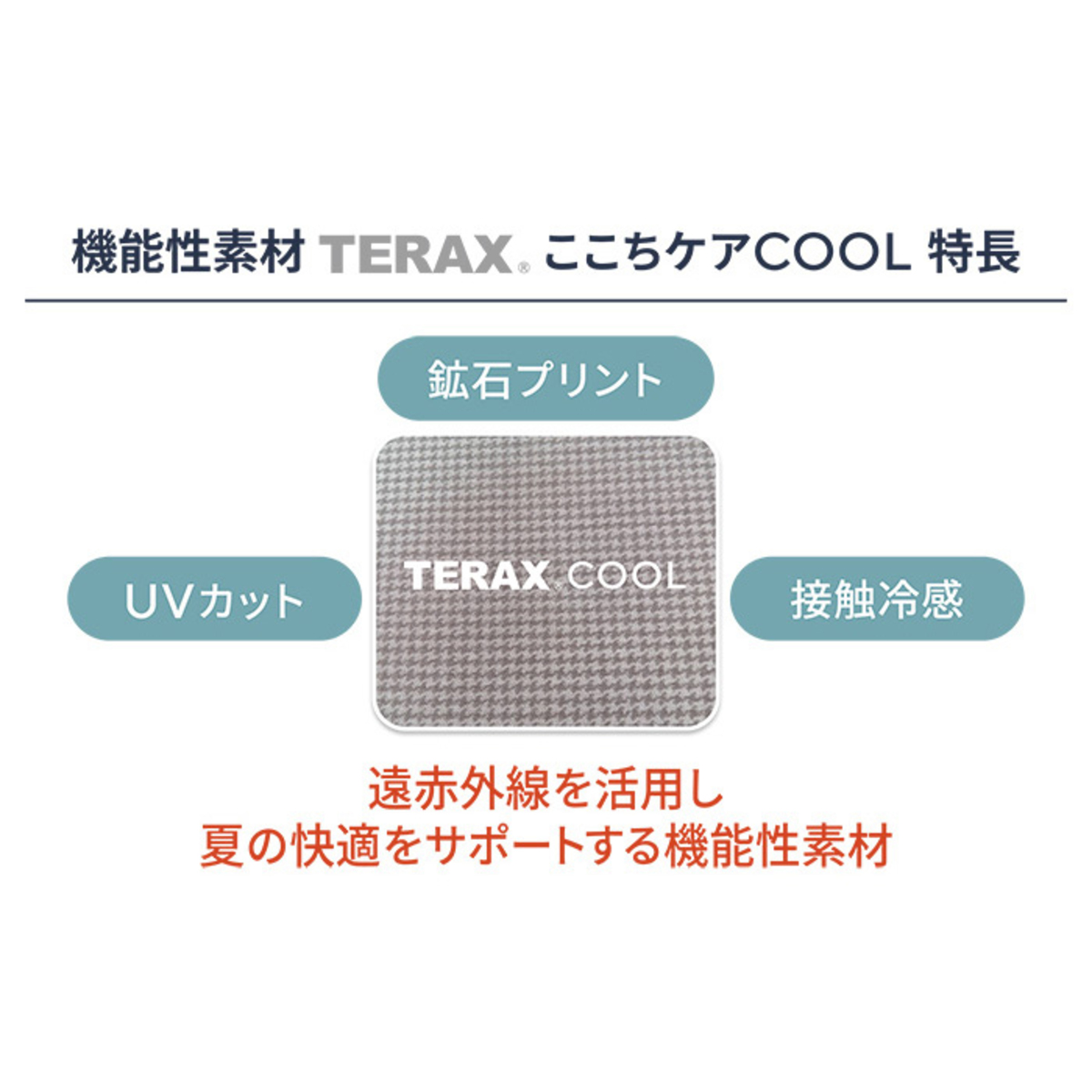 「ここちケアCOOL」は、TERAX独自の技術で生地に特殊な鉱石プリント加工を施し、体の熱を効率よく逃がしながら外からの熱を遮ることで、衣服内を涼しく快適に保つ機能を備えた冷感ケア技術です。暑い季節でも快適な着心地を実現します。