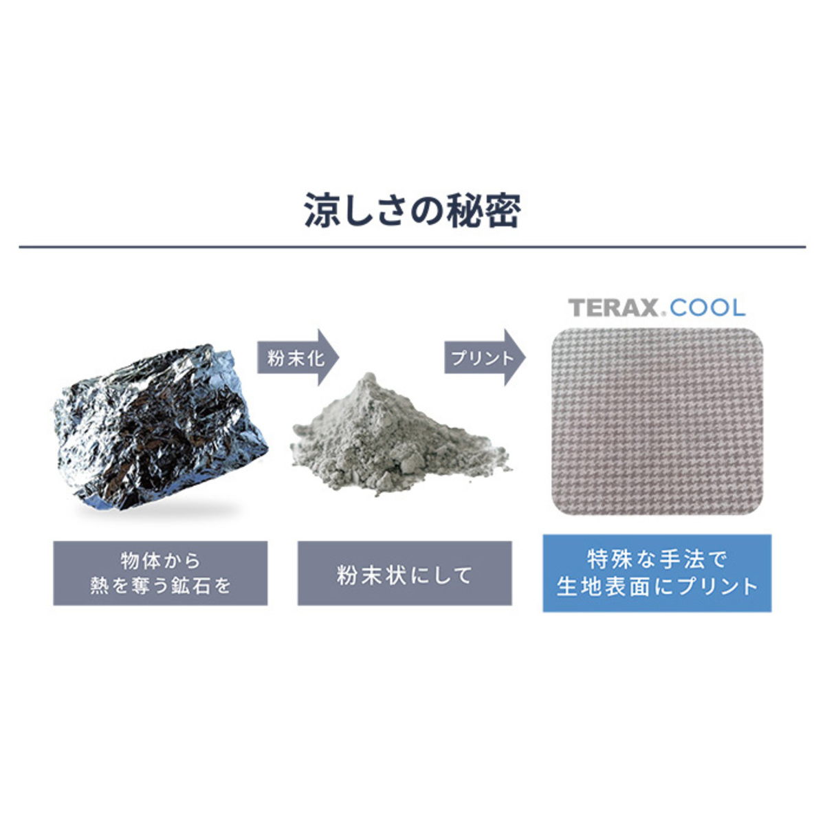 遠赤外線を放射する岩盤浴などで人気のテラヘルツ鉱石を主原料に、生地へプリント加工したTERAX独自の機能性素材です。冷感や放熱、遮熱などの効果で、衣服内を快適に保ちます。※テラヘルツ鉱石:水晶を高温で溶かし、二酸化ケイ素から純度の高い半導体のケイ素に加工した人工鉱石です