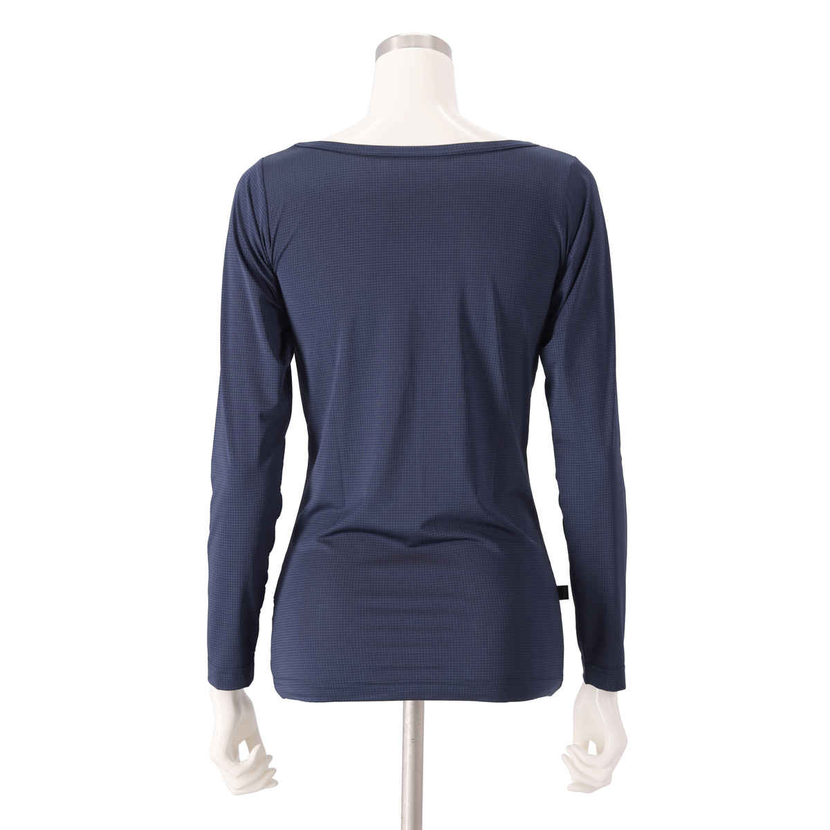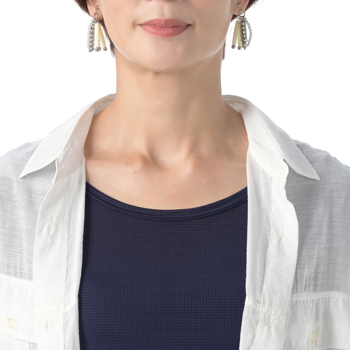 鉱石を含んだ加工プリント部分が身体の熱を吸収する事で遠赤外線を輻射されます。本品は鉱石プリント生地を使った長袖シャツ。UVカット機能、接触冷感性のある生地を使用しています