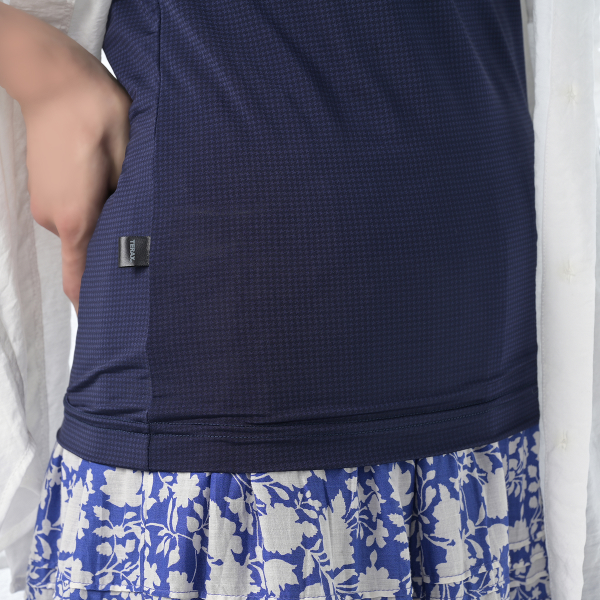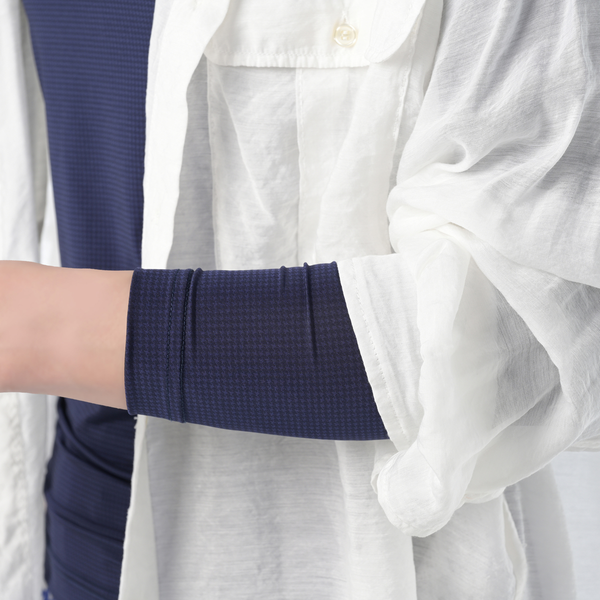 糸に練り込まずに生地に千鳥格子柄のプリントをしたことで、生地そのままの部分とプリント部分があるので、生地の柔らかさや伸び感はそのままに遠赤外線の輻射もプリント部分から行われます