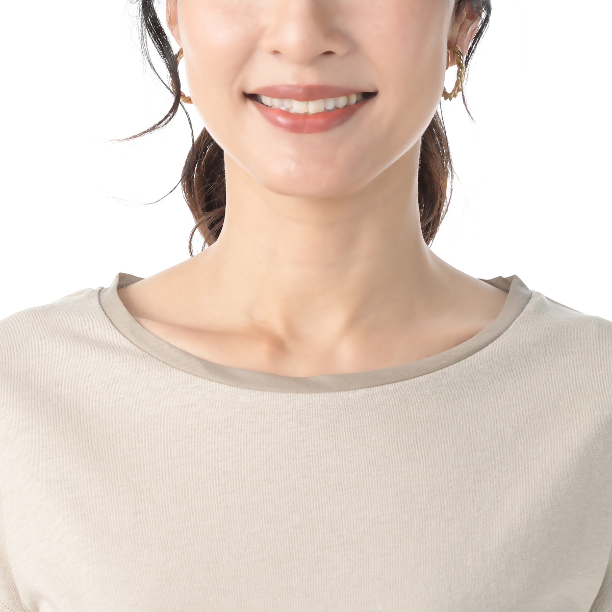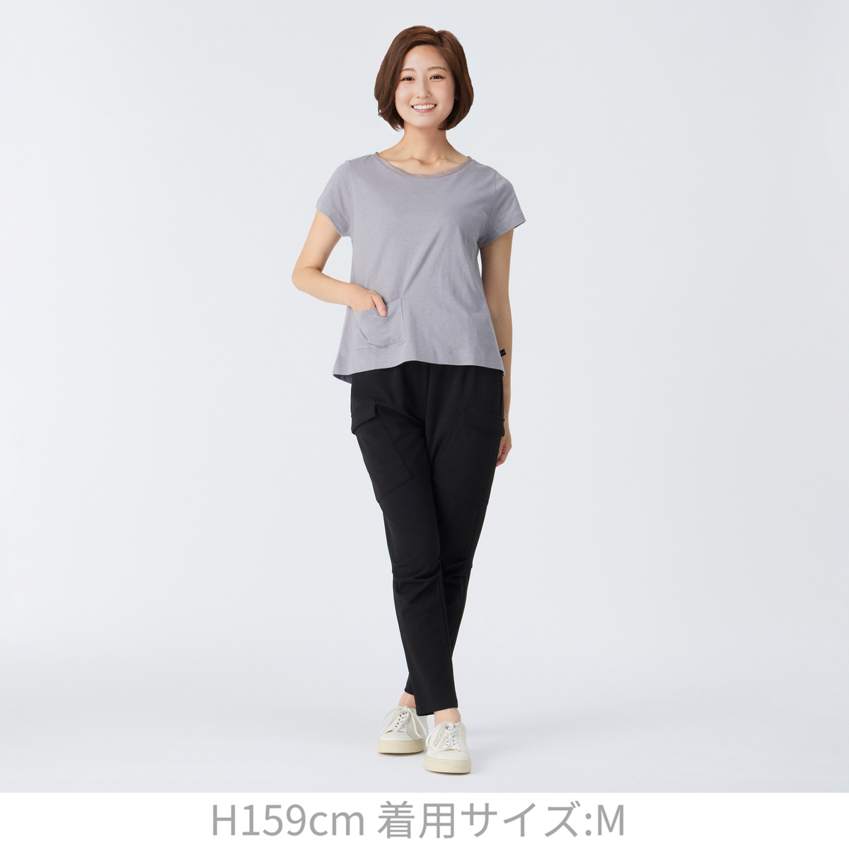 シンプルな中にも、衿ぐりやポケットでさりげないアクセントをプラス。後ろの裾は少しラウンドさせて、柔らかな雰囲気を醸し出します