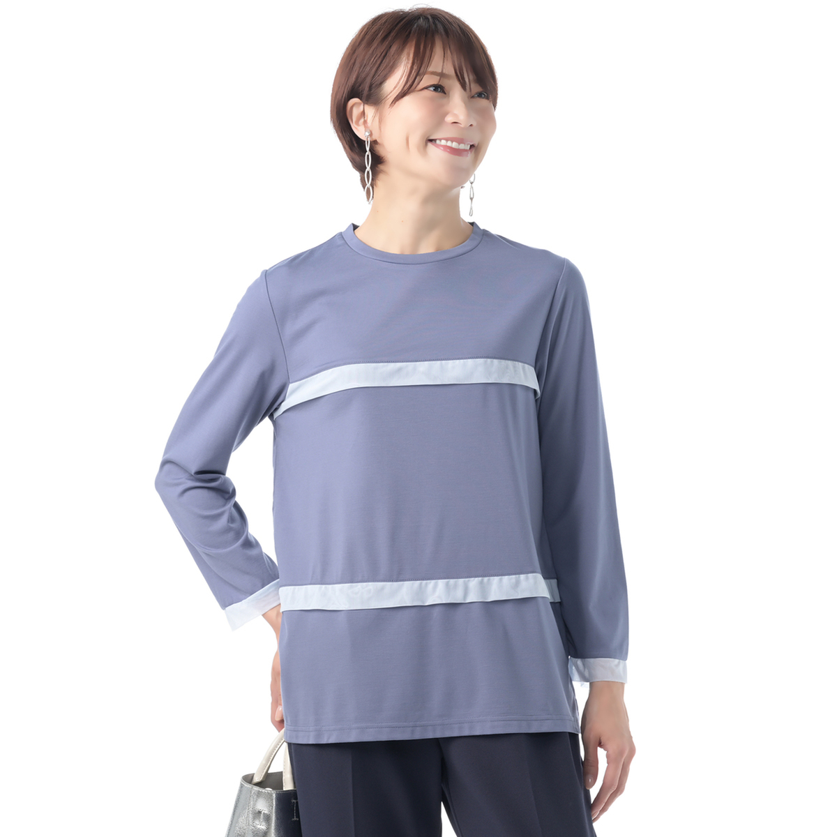切替部分にストレッチチュールをはさみ、華やかに仕上げた異素材使いのプルオーバー。シンプルなデザインで様々なコーデに活躍してくれます