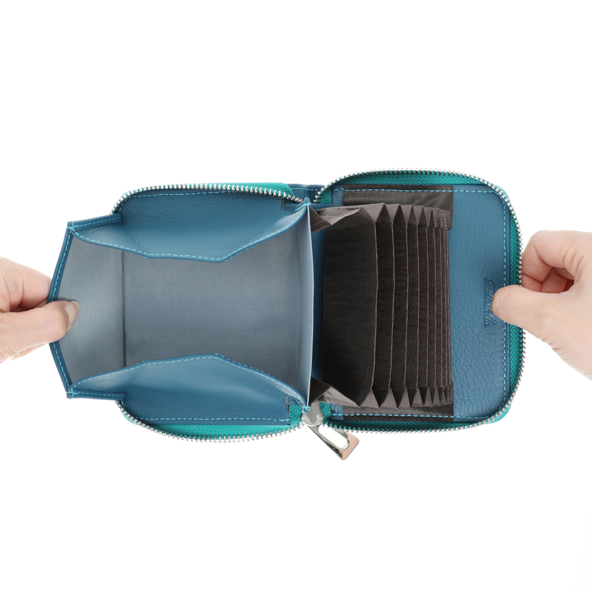 内装には、牛本革を使用。耐久性はもちろんのこと、外装に合わせて内装の色を変えているため、使用時の印象も大きく変わります。また、コバ周りを丁寧に牛本革で覆うことで縫い代へのダメージを与えにくく高級感のある演出をしています。縫製や使用感などは、現地に駐在する専任の日本人スタッフによってジャパンクオリティをとことん追求しています