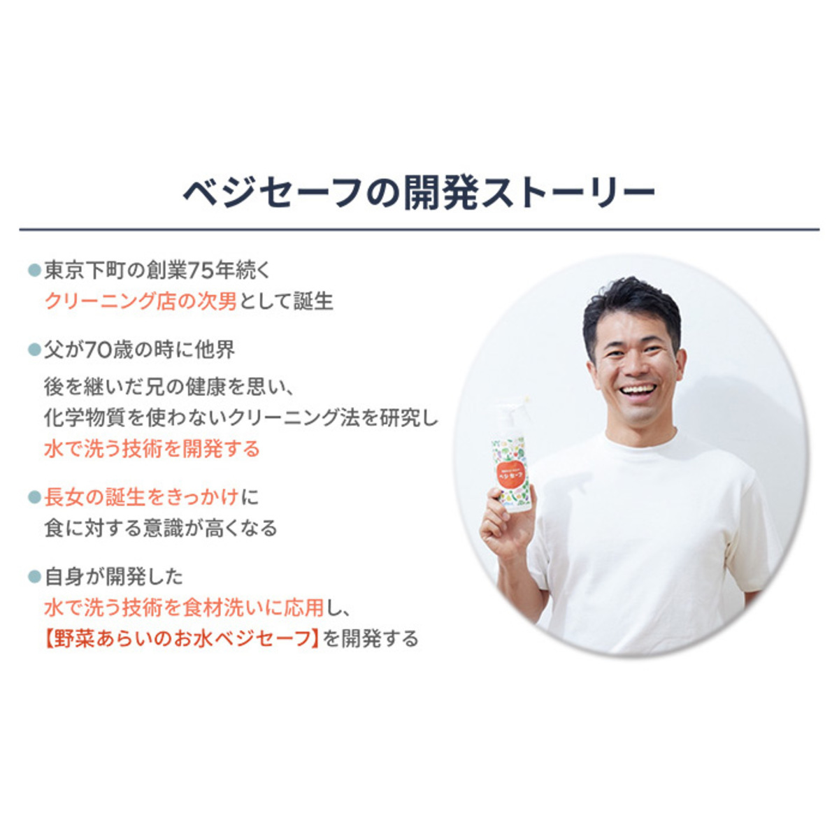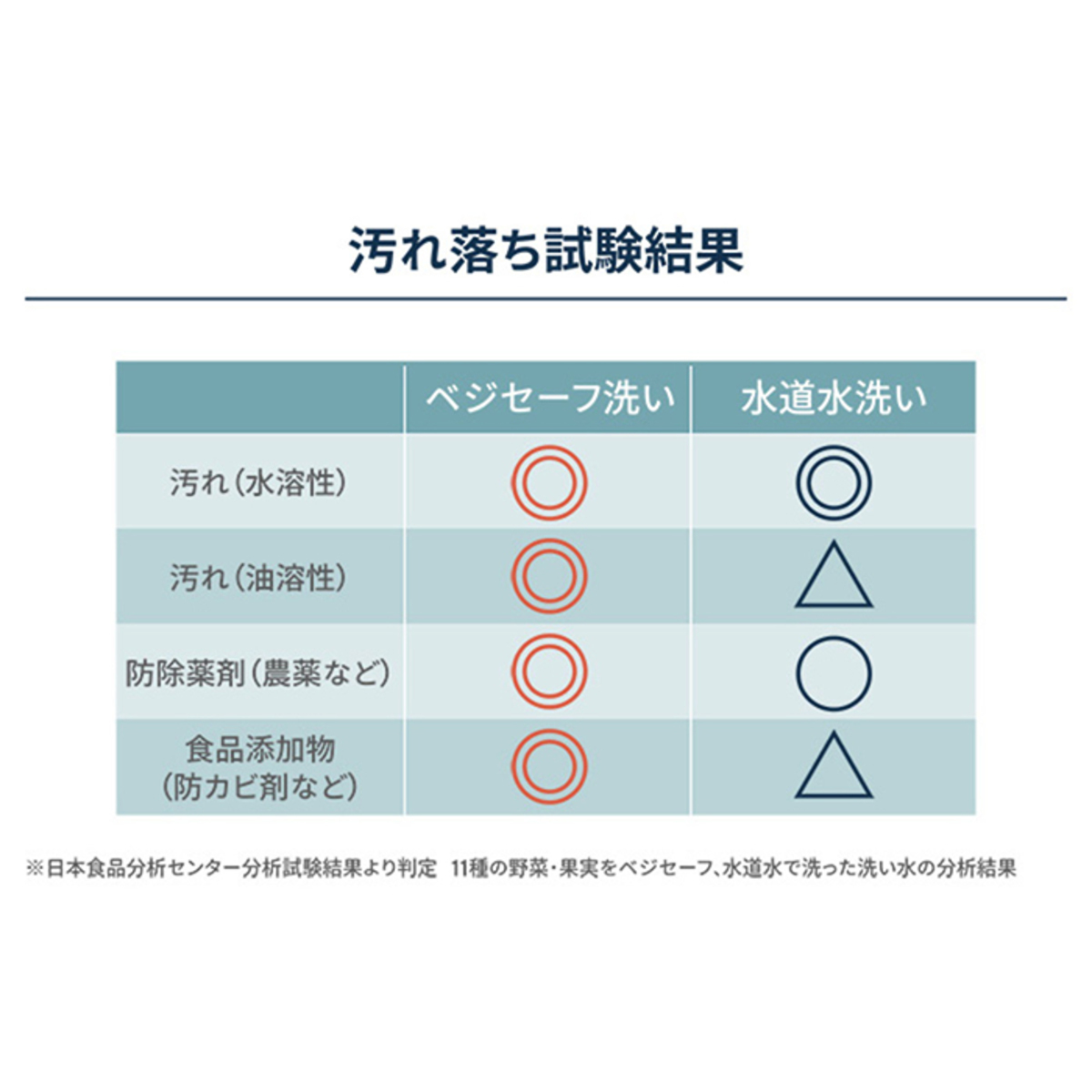 [内容量] 400ml [液性] アルカリ性 [使用目安] 野菜約292gに対し5プッシュ(6.5ml)が目安になります [使用方法] <スプレー洗い> 1.食材に満遍なく水滴がつくようにスプレーをする 2.10〜20秒なでつける(お魚は10秒ほど置いて流水で流す) 3.流水で流して完了(お魚はキッチンペーパーなどで水気を拭き取って完了) <まとめ洗い> 1.大きめのボール又はたらいに、水道水1Lとベジセーフ100mlを混ぜた洗い水を用意する 2.洗いたい食材を入れ、20〜30秒食材全体に洗い水が行き渡るよう、なでまわす 3.流水で流して完了 ※作った洗い水は、繰り返し使えます(約1時間以内にお使いください) ※まとめ洗い後、冷蔵保管すると鮮度が持ちやすくなります ※洗い水の作り置きはしないでください [注意事項] ※詰め替えの際は薄めず、原液のままお入れください ※その他の液体と混ぜて使用しないでください ※開封後はお早めにご使用ください ※用途以外に使用しないでください ※幼児の手の届かないところで保管してください ※飲用しないでください ※目に入った場合は、水で洗い流してください ※詰め替え時はベジセーフを薄めず原液で入れてください ※人に使用しないでください ※窒息の原因になる可能性があるので、容器キャップは常に固く締め、子どもやペットが誤って口に入れないようにしてください ※容器が変形したり、破損したりする恐れがあるので、電子レンジや直火で加熱しないでください ※直射日光、高温多湿を避け、屋内にて保管して下さい ※目に入った場合:目をこすらず水で洗い流し、異常が続く場合は医師に相談してください ※誤って多量に飲んでしまった場合:水を摂取して、異常が続く場合は医師に相談してください 【日本製】 [成分] 還元型アルカリバブル電解水 純水99.88% / カリウム0.12%