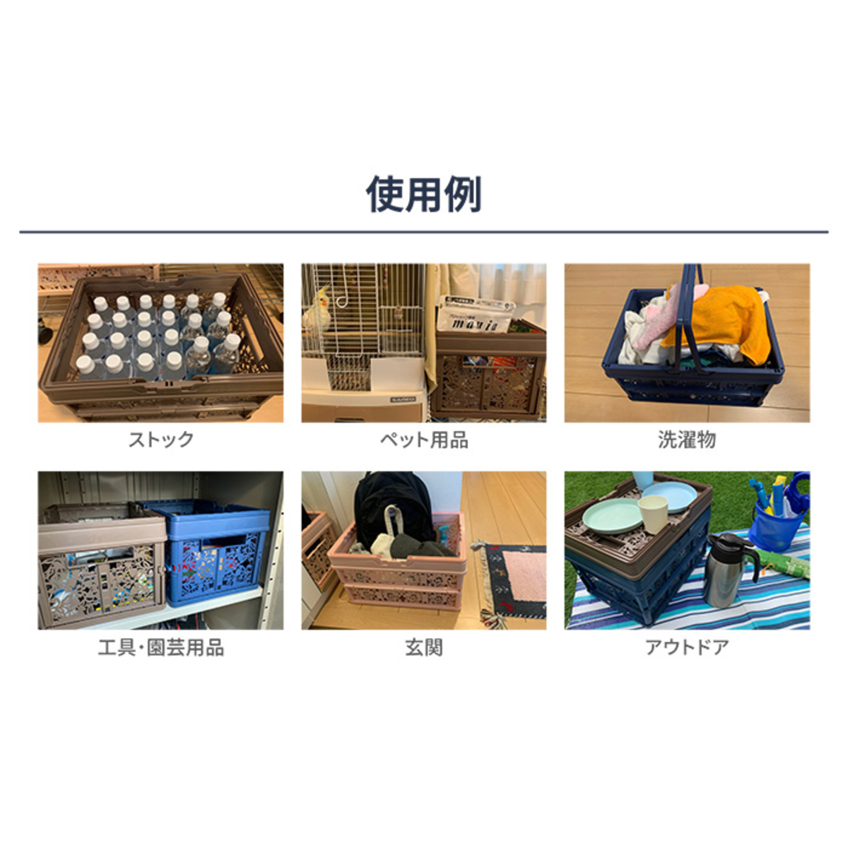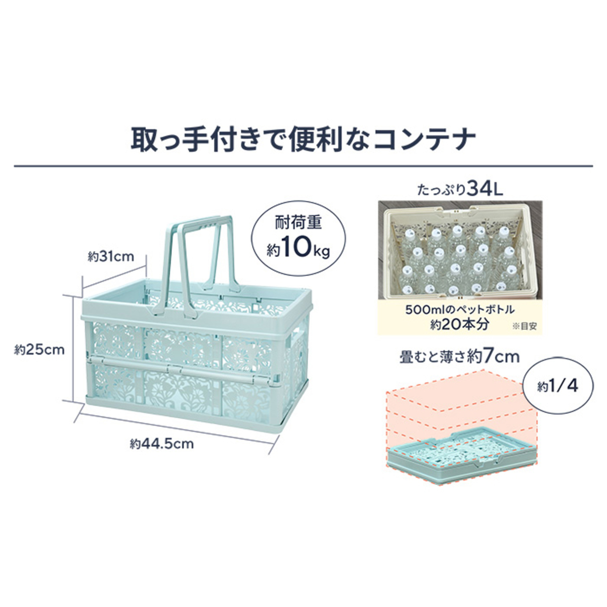 [サイズ(約)] 折り畳み時:幅44.5×奥行31×高さ7cm 展開時:幅44.5×奥行31×高さ25cm (ハンドルを立てた時の高さ:40cm) [重量] 約920g [材質] 合成樹脂 [耐荷重] 約10kg [使用方法] 1、折り畳まれた本体を水平で安定した場所に置きます 2、本体の上部を持ち上げて側面を立たせます ※部材の隙間に指を挟まないようご注意下さい 3、本体の内側から端面を押し出します。本体枠に固定されるまでしっかり押し出して下さい ※反対側の端面も同様に押し出して下さい 4、本体上部のハンドルを引き上げて本体を持ち運びます ※ハンドルを畳み、端面両側に手を掛けて持ち運ぶこともできます ※折り畳む場合は逆の手順で進めます [お手入れ] ・汚れた場合は乾いた布でやさしく拭き取って下さい ・汚れが酷い場合は、濡らして固く絞った布で拭いて下さい ・ベンジンやシンナーなどの溶剤や研磨剤を含む洗剤は使用しないで下さい ・直射日光を避け、涼しい場所で保管して下さい ■取り扱い説明を充分にご確認の上、ご使用下さい 【中国製】 [注意事項] ※同一製品を積み上げて使用することができます(積み上げ限度数量:本品3個まで)。その際、下段に加わる重量が耐荷重量を超えないようにして下さい ※耐荷重量(約10kg)よりも重いものを載せないで下さい ※耐荷重量の範囲内であっても、本品の形状に歪みや変形等が見られた場合は、直ちに本品の使用を中止して下さい ※本品は家庭用品です。業務用として使用しないで下さい ※本品は玩具ではありません。子供に本品で遊ばせないで下さい。乳幼児の手の届かないところに置いて下さい ※火や高温の熱源のそばに置かないで下さい ※改造、分解は行わないでください。破損の原因となります ※本品に割れ、ヒビ、変形、ハンドルの歪み・脱落等の破損・損傷がないか、事前にご確認の上、ご使用下さい ※収納・運搬以外の用途で使用しないで下さい ※水平で安定した場所で本品を展開して下さい ※本品表面を鋭利なもので突かないで下さい。部材が破損する恐れがあります ※直射日光が当たる場所や高温多湿の場所での使用は避けて下さい。本品の変形、変色の恐れがあります ※壁にぶつける、固い物で叩く、高い所から落とす等、本品に強い衝撃を与えないで下さい。本品が破損する恐れがあります ※本品表面に割れ、欠けが生じた場合は、直ちに使用を中止して下さい。破損個所に触れて怪我をする恐れがあります ※廃棄する場合は、各自治体のルールに従って廃棄して下さい