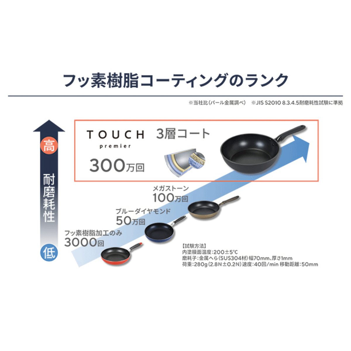 耐磨耗性試験300万回をクリア(*2)。フッ素樹脂、強化セラミックス特殊配合ミドルコート、硬質セラミックスダブル配合プライマー(ダイヤモンド微粒子・硬質セラミックス配合)の3層コートを施しています