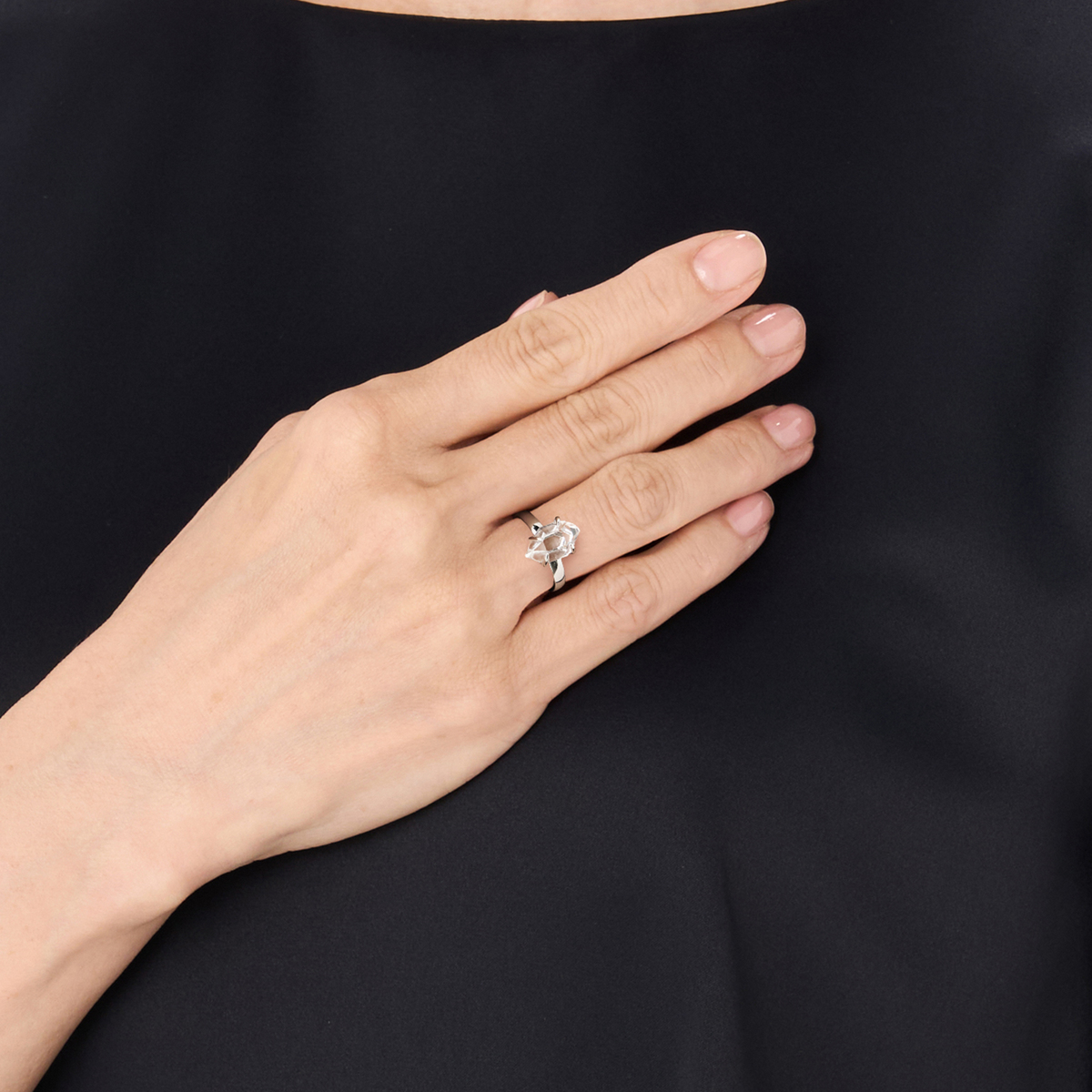 ハーキマーダイヤモンド(水晶)の名称で流通している、ニューヨーク州ハーキマー産の水晶を使用。原石そのままの形状を活かした、シンプルな4本爪デザインのリングです