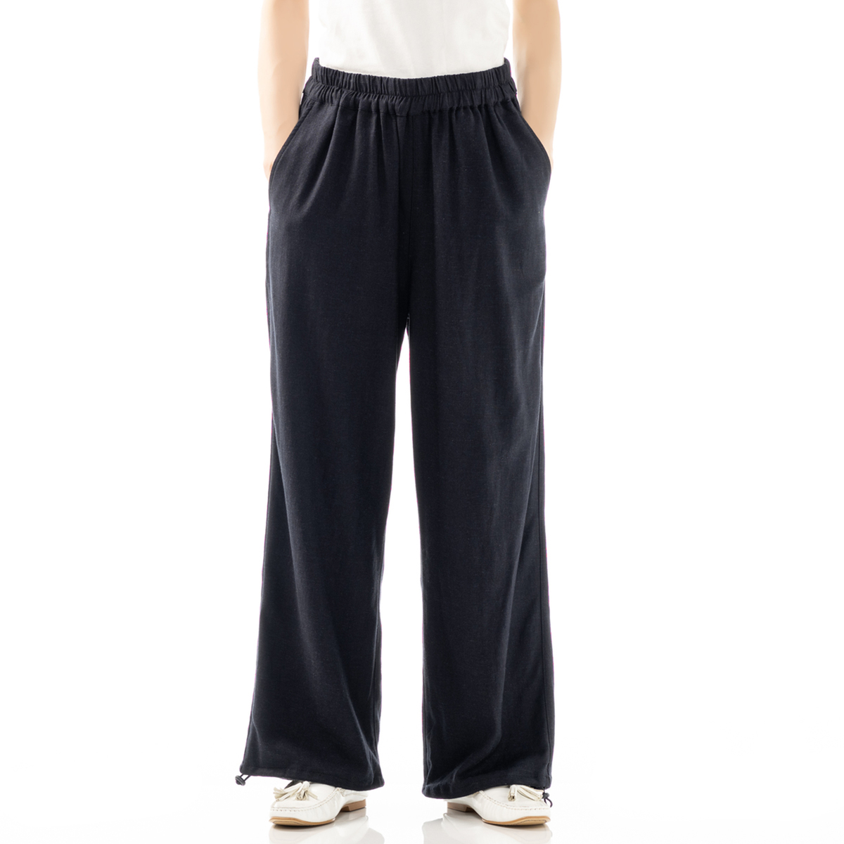 麻混の布帛ツイル素材を使用したストレートパンツ。裾には丸ゴム&ストッパー付きでシルエットのアレンジが可能。絞った状態で少したくし上げてクロップド丈にしたり、その日の気分やスタイリングに合わせて楽しめます