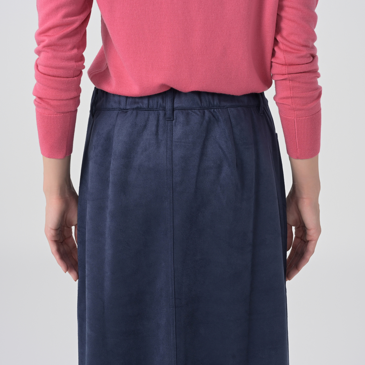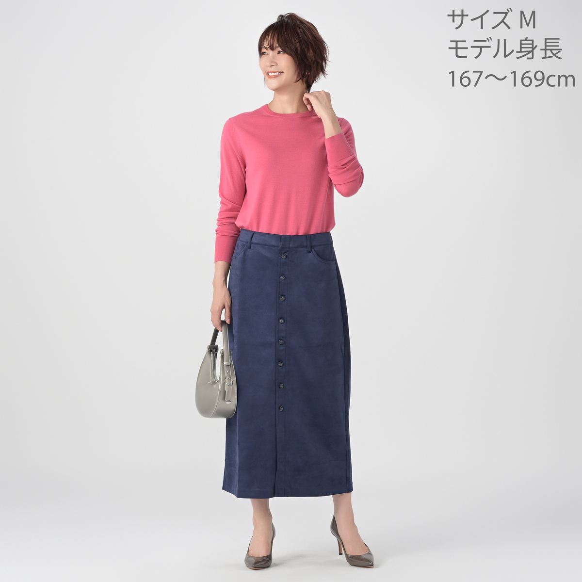 後ろウエストゴムのプルオンタイプで楽な穿き心地のスカートです。前ボタンは飾りですが、裾から2つ目まで開閉でき、ベンツの長さを調節可能。前左右には便利なポケットを付けました