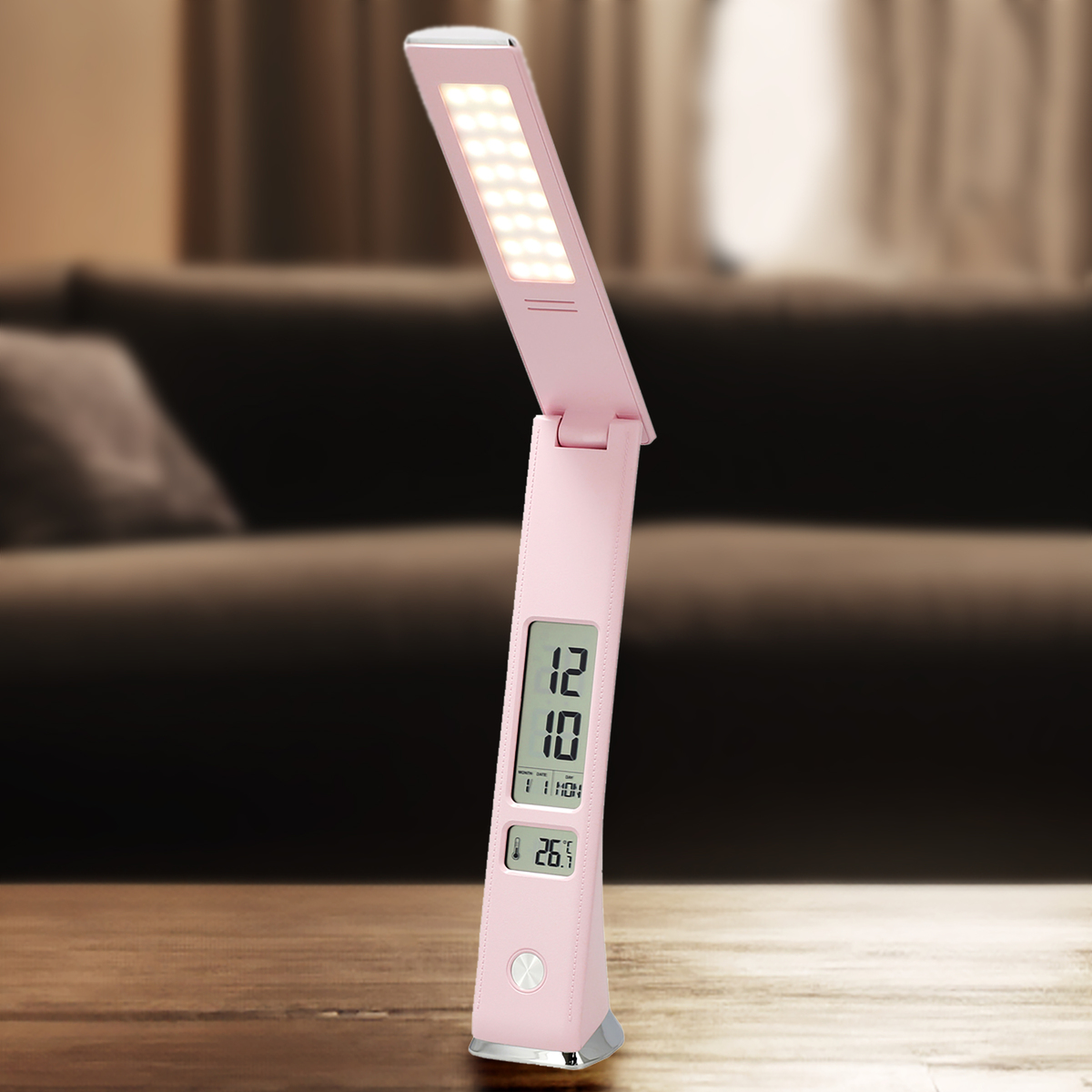 時計、日付、曜日、温度が表示されるディスプレイ付きデスクライト。アラーム&スヌーズ機能も搭載し、書斎だけでなく寝室にもおすすめです