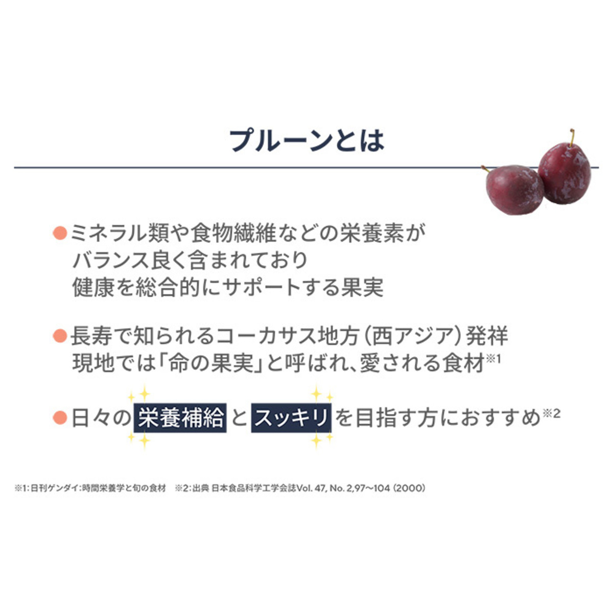原料はプルーン濃縮果汁50%と難消化性グルカン(食物繊維)50%*。城咲仁さん監修のプルーンエキスで、本品の原料の1つである難消化性グルカンは、2017年度農芸化学技術賞を受賞した生産方法で製造しています
