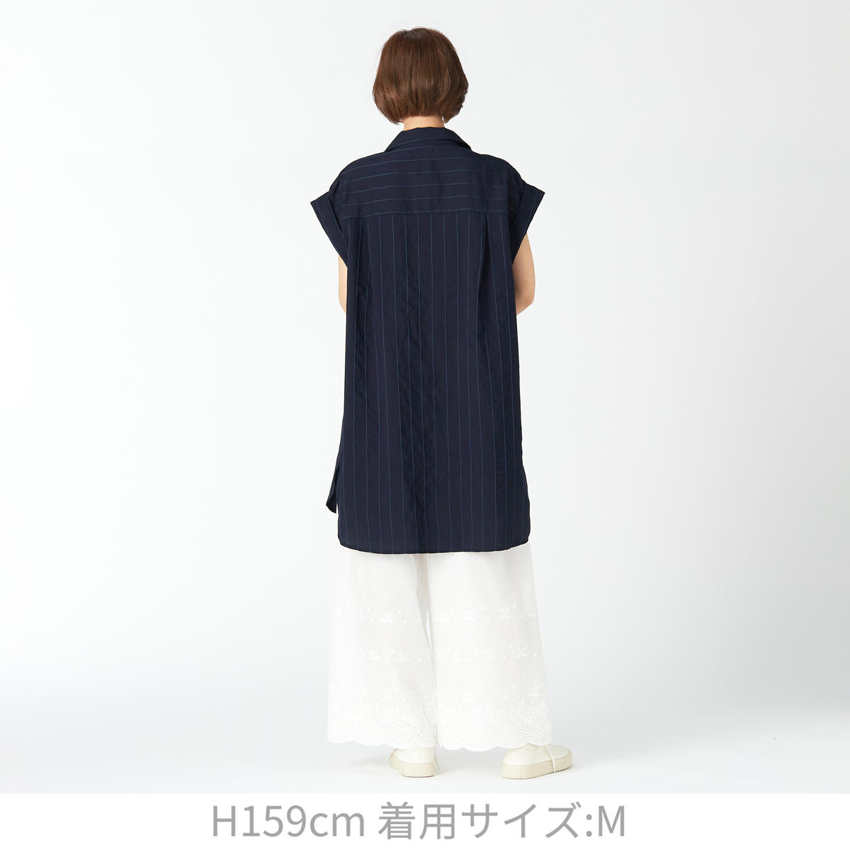 シャリ感のある軽やかな素材を使用しました。お尻まですっぽり隠れる着丈と、ノースリーブでも腕が出にくい裄丈で、安心感のあるシルエットに仕上げています