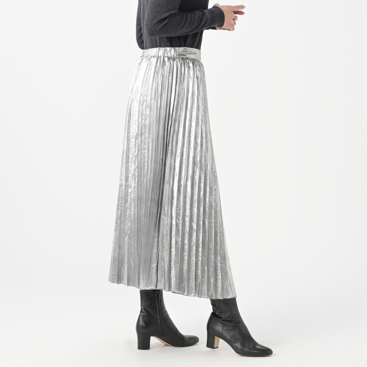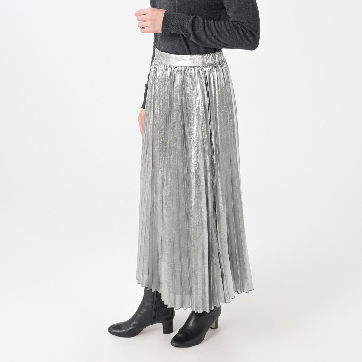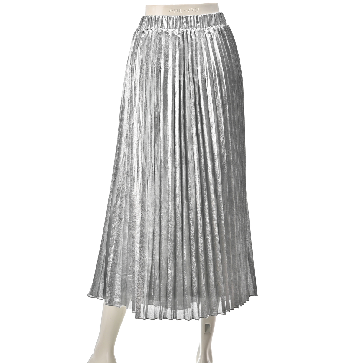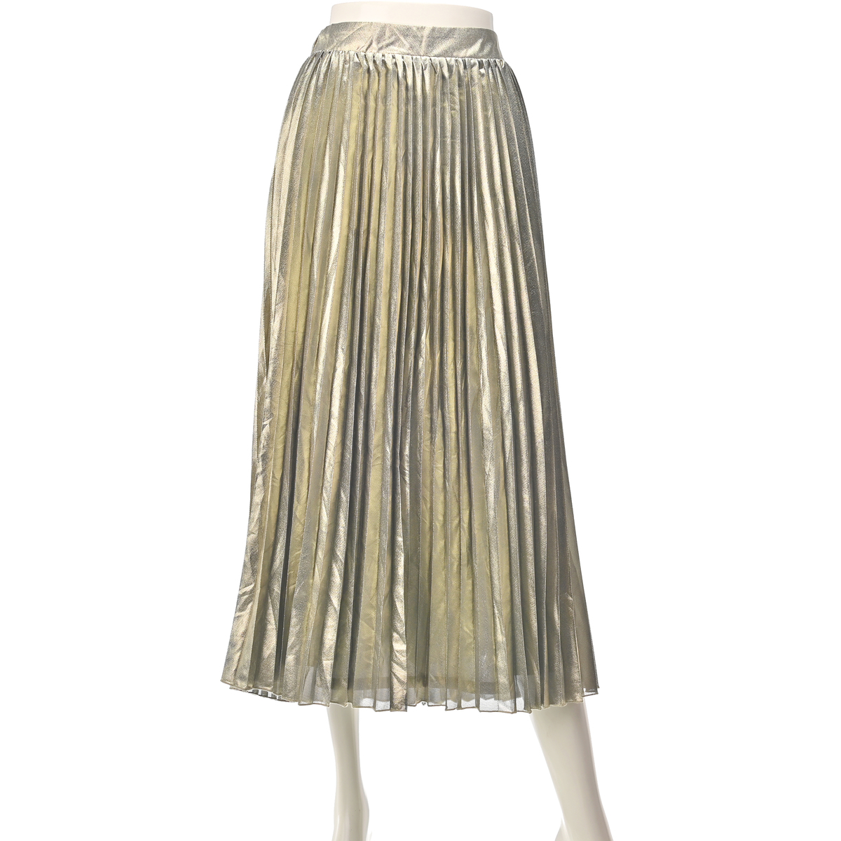 目を引くメタリックカラーのプリーツスカート。特別なイベントやディナーなどにもおすすめです。ミディ丈で洗練されたシルエットを演出し、フォーマルにもカジュアルシーンにも活躍します