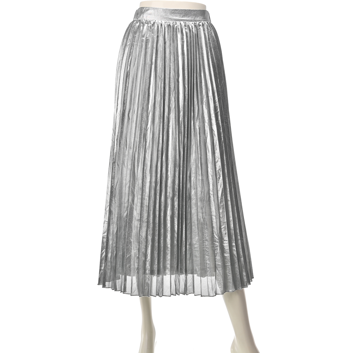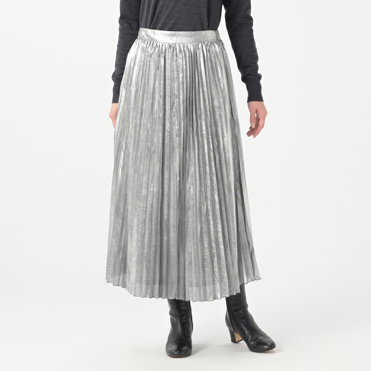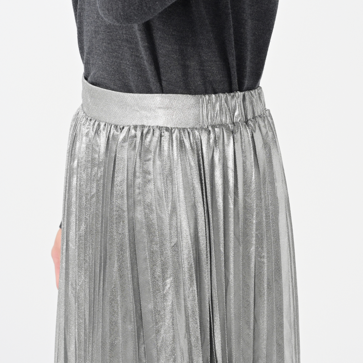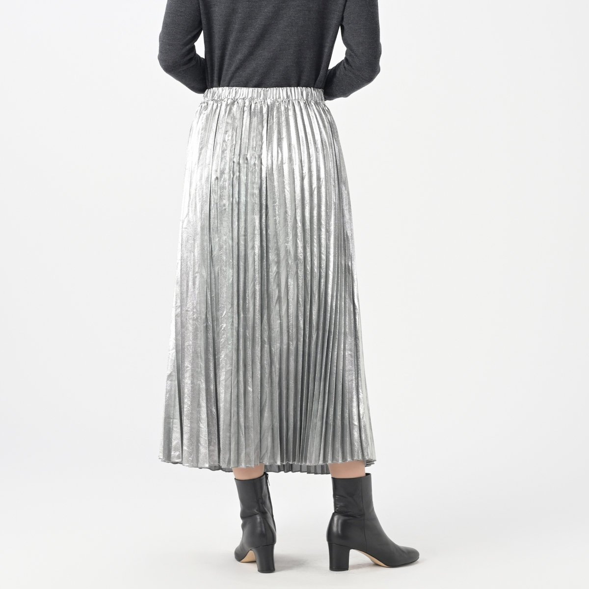 目を引くメタリックカラーのプリーツスカート。特別なイベントやディナーなどにもおすすめです。ミディ丈で洗練されたシルエットを演出し、フォーマルにもカジュアルシーンにも活躍します