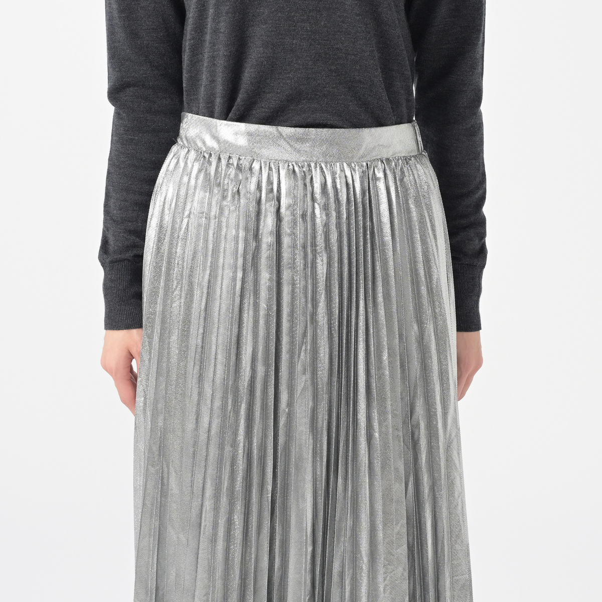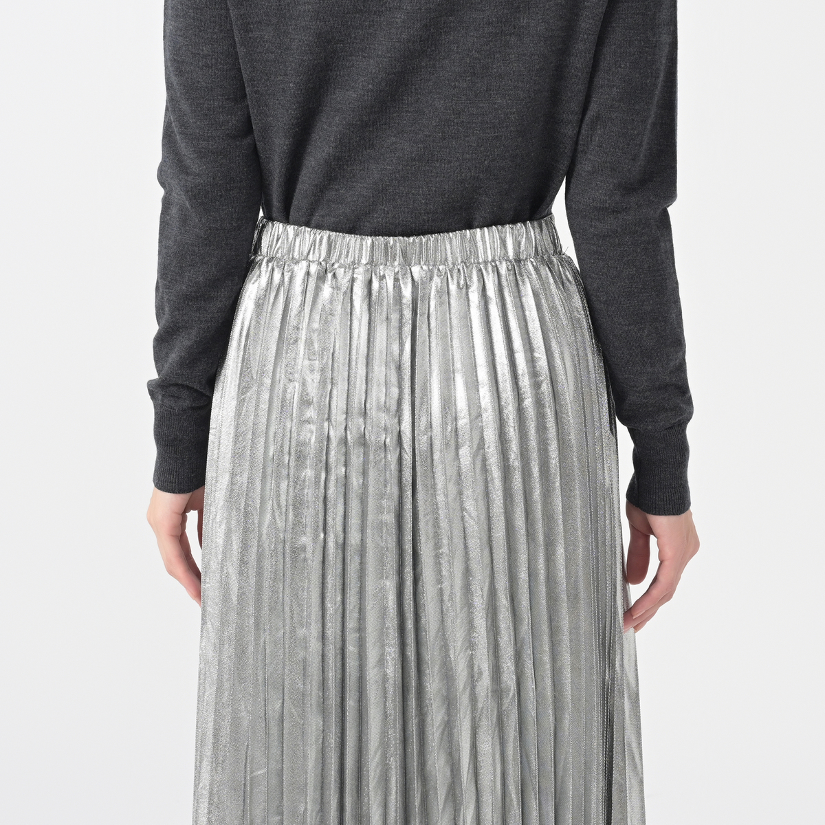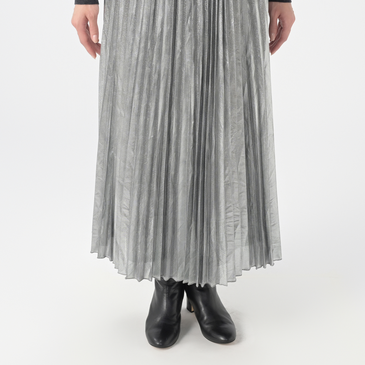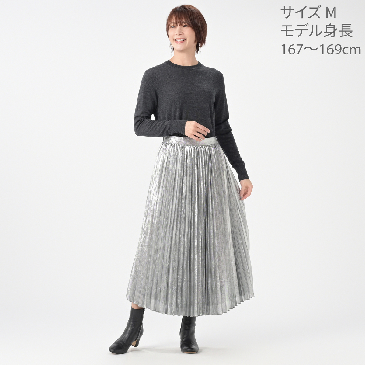 目を引くメタリックカラーのプリーツスカート。特別なイベントやディナーなどにもおすすめです。ミディ丈で洗練されたシルエットを演出し、フォーマルにもカジュアルシーンにも活躍します