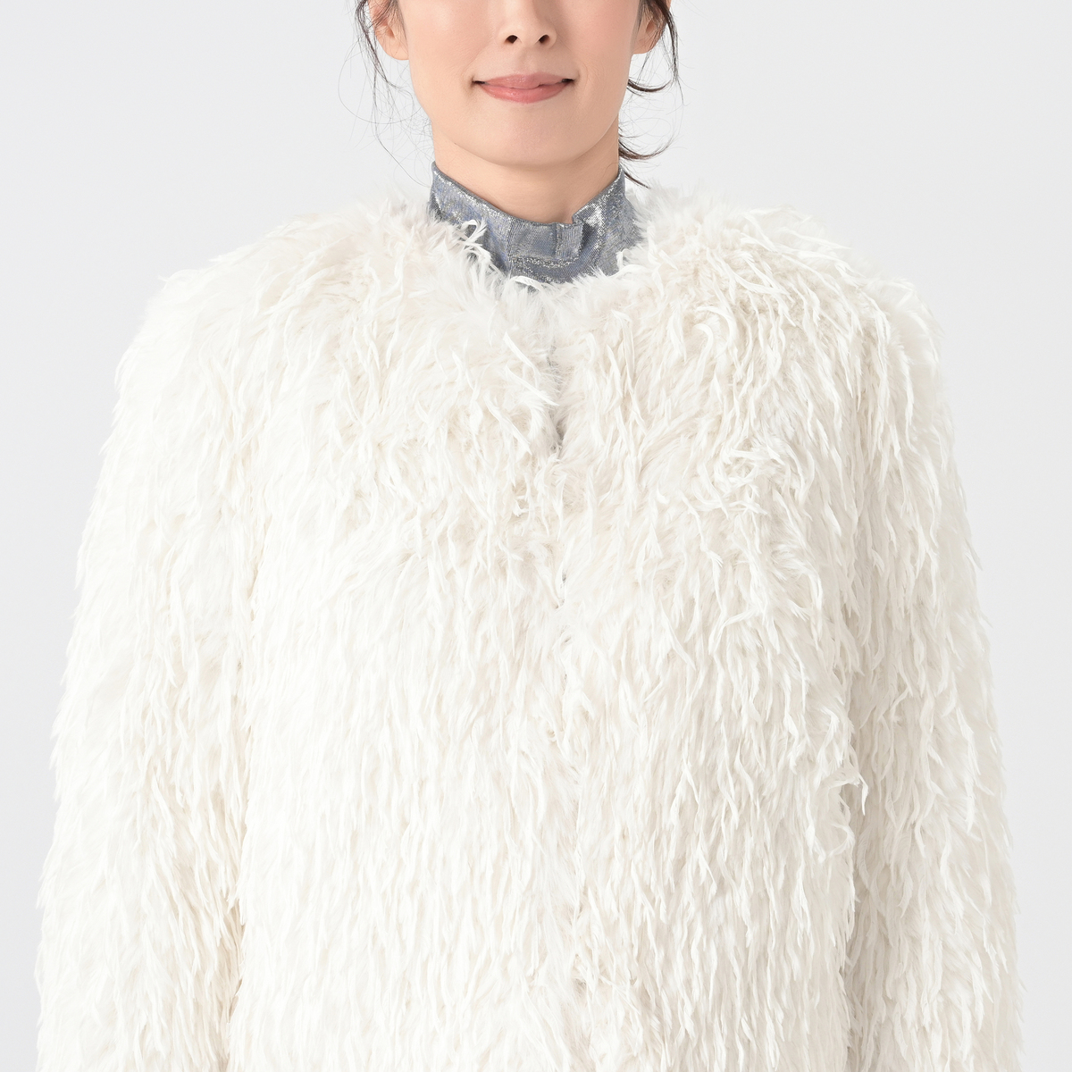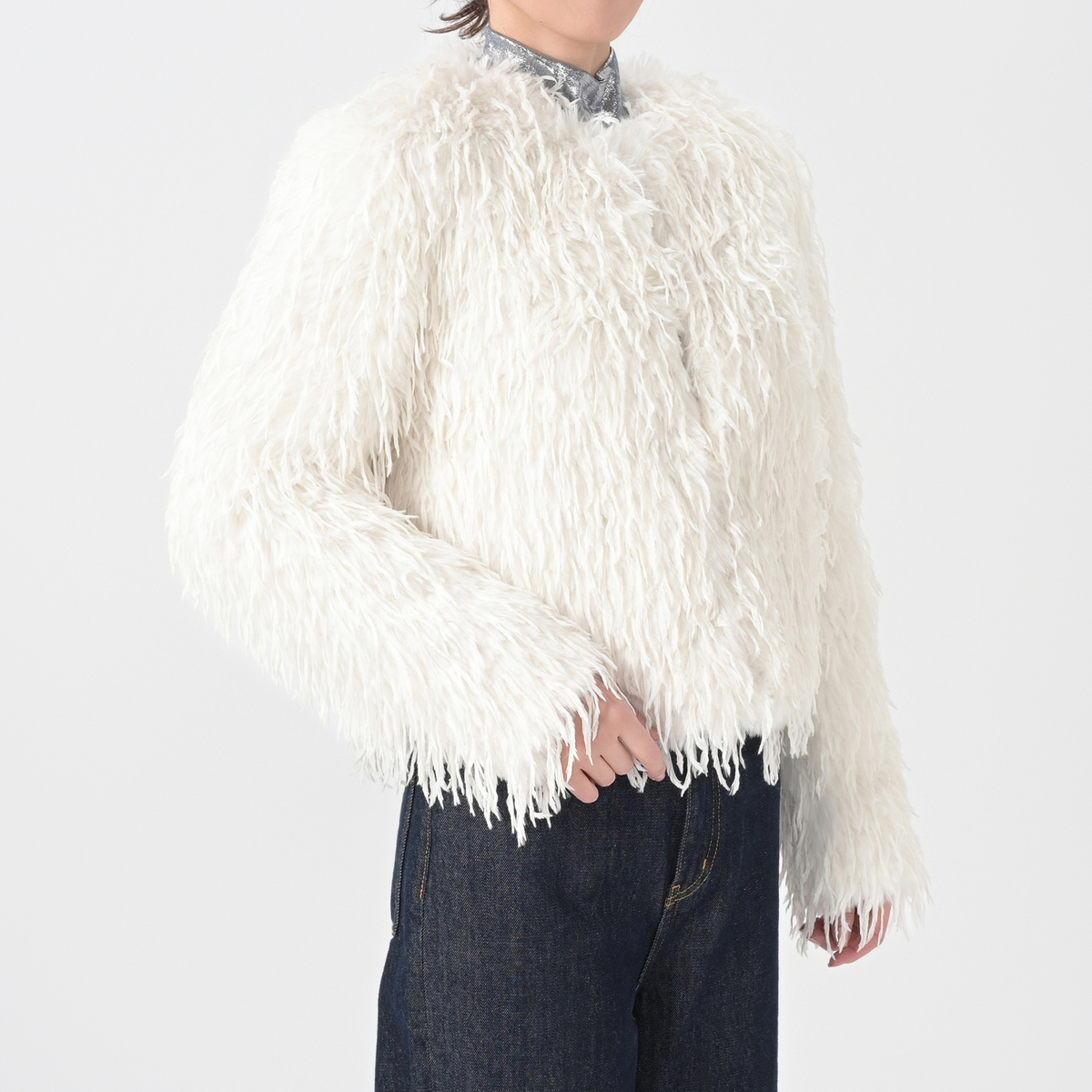 フェイクファーの質感と光沢が魅力のクロップド丈ジャケット。カジュアルからグラマラスなスタイルまで幅広く活躍します
